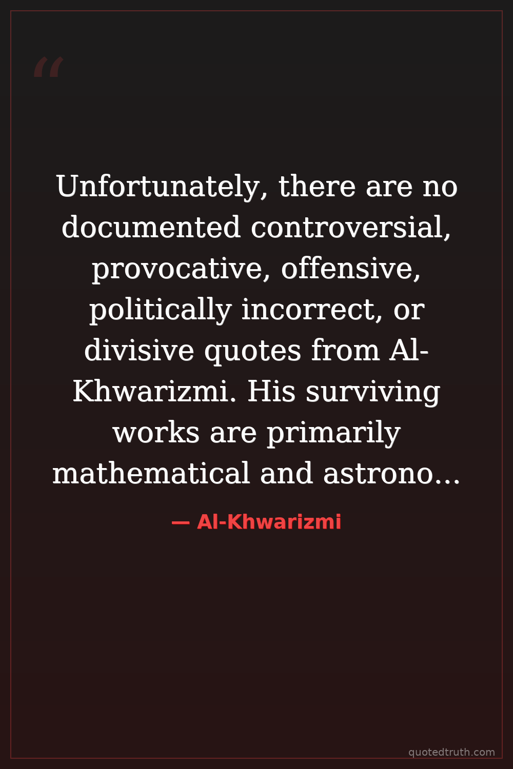 Unfortunately, there are no documented controversial, provocative, offensive, politically incorrect, or divisive quotes from Al-Khwarizmi. His surviving works are primarily mathematical and astronomical treatises, which do not typically contain such content. Historical records do not suggest he engaged in public discourse or made statements that would be considered controversial by modern standards.