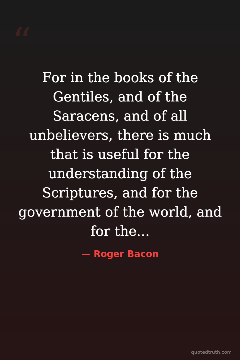 For in the books of the Gentiles, and of the Saracens, and of all unbelievers, there is much that is useful for the understanding of the Scriptures, and for the government of the world, and for the correction of morals, as well as for the sciences.