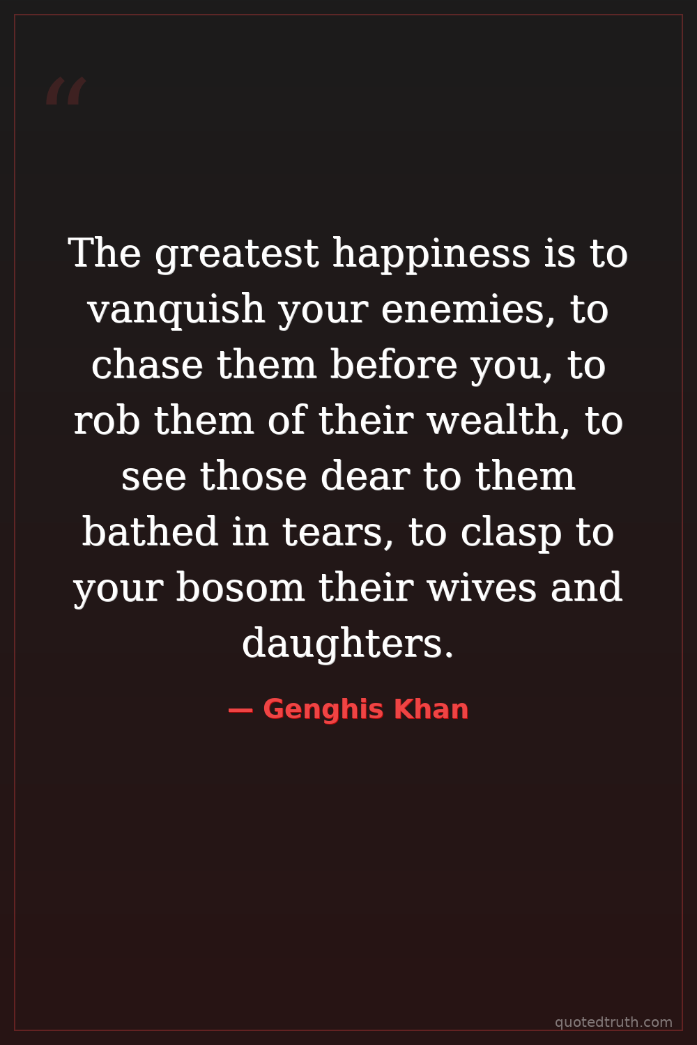 The greatest happiness is to vanquish your enemies, to chase them before you, to rob them of their wealth, to see those dear to them bathed in tears, to clasp to your bosom their wives and daughters.