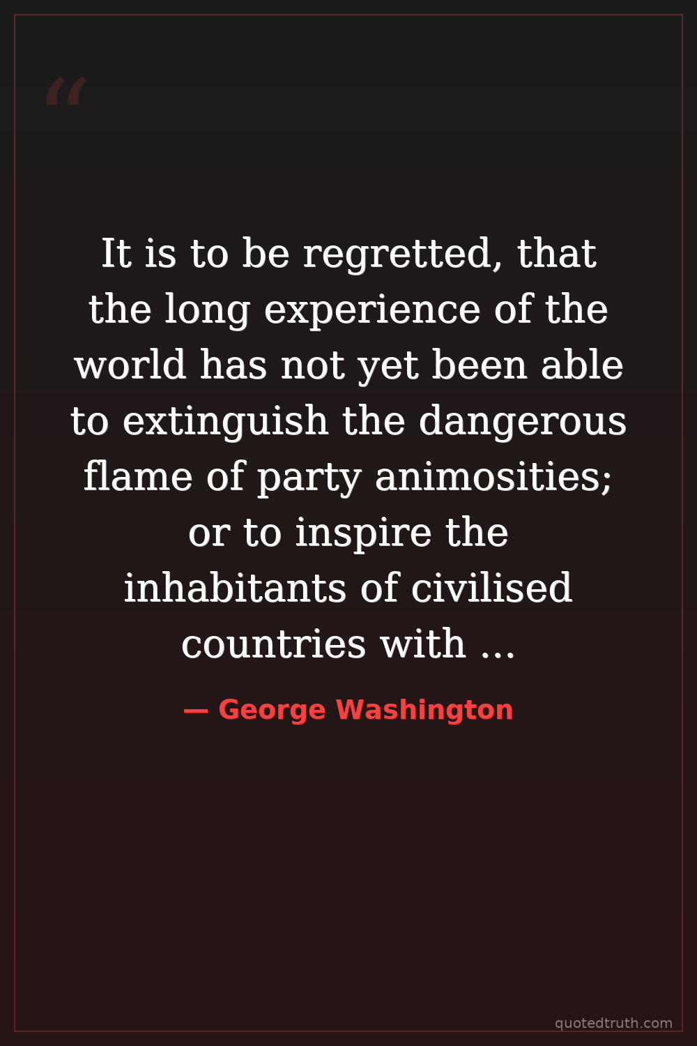 It is to be regretted, that the long experience of the world has not yet been able to extinguish the dangerous flame of party animosities; or to inspire the inhabitants of civilised countries with a more pacific disposition towards each other. — George Washington Early Modern First US President