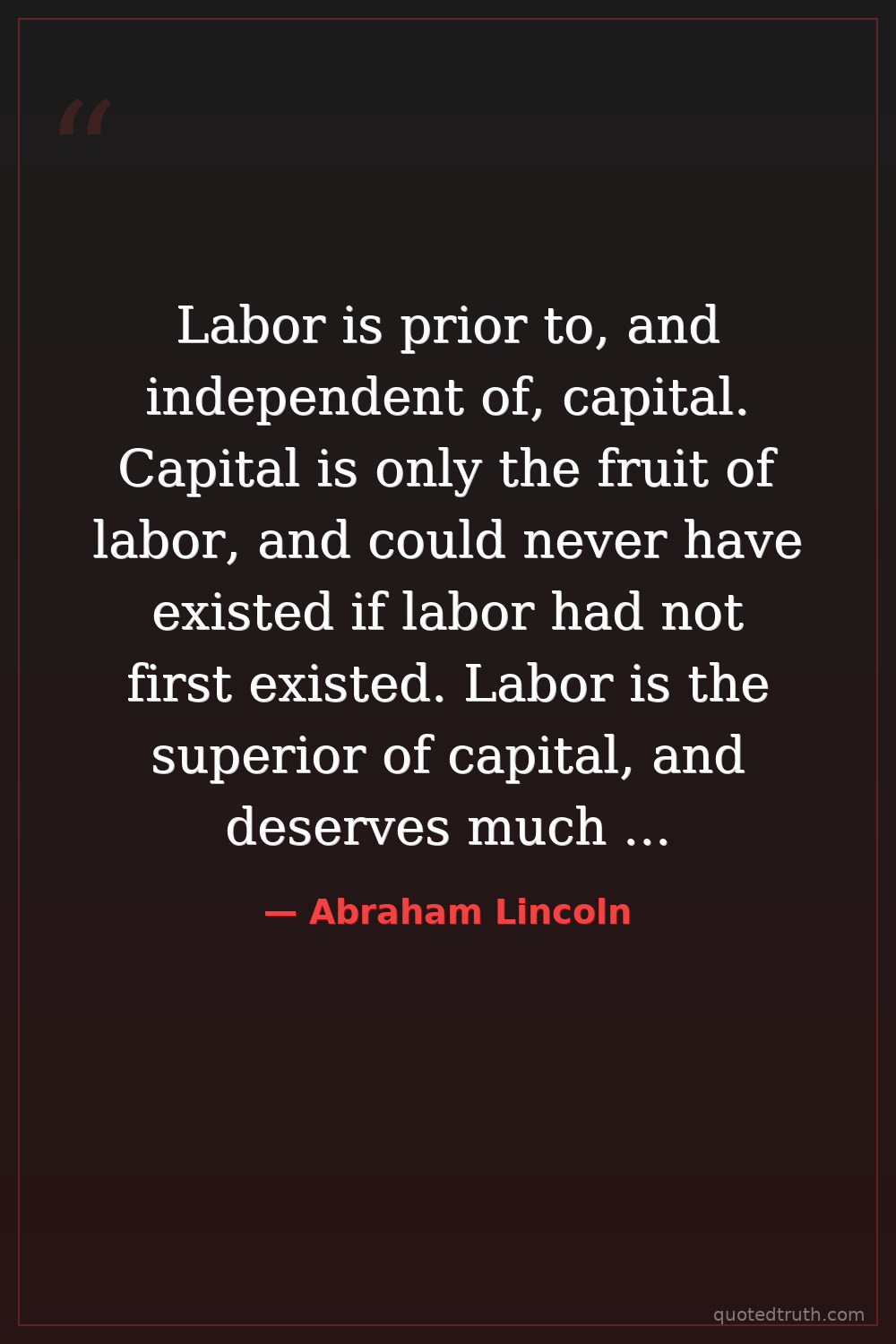 Labor is prior to, and independent of, capital. Capital is only the fruit of labor, and could never have existed if labor had not first existed. Labor is the superior of capital, and deserves much the higher consideration. — Abraham Lincoln Modern Preserved the Union, ended slavery