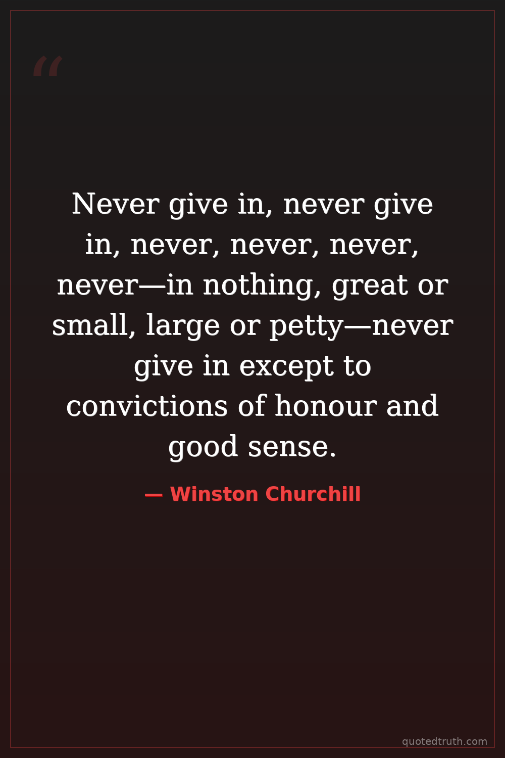 Never give in, never give in, never, never, never, never—in nothing, great or small, large or petty—never give in except to convictions of honour and good sense.