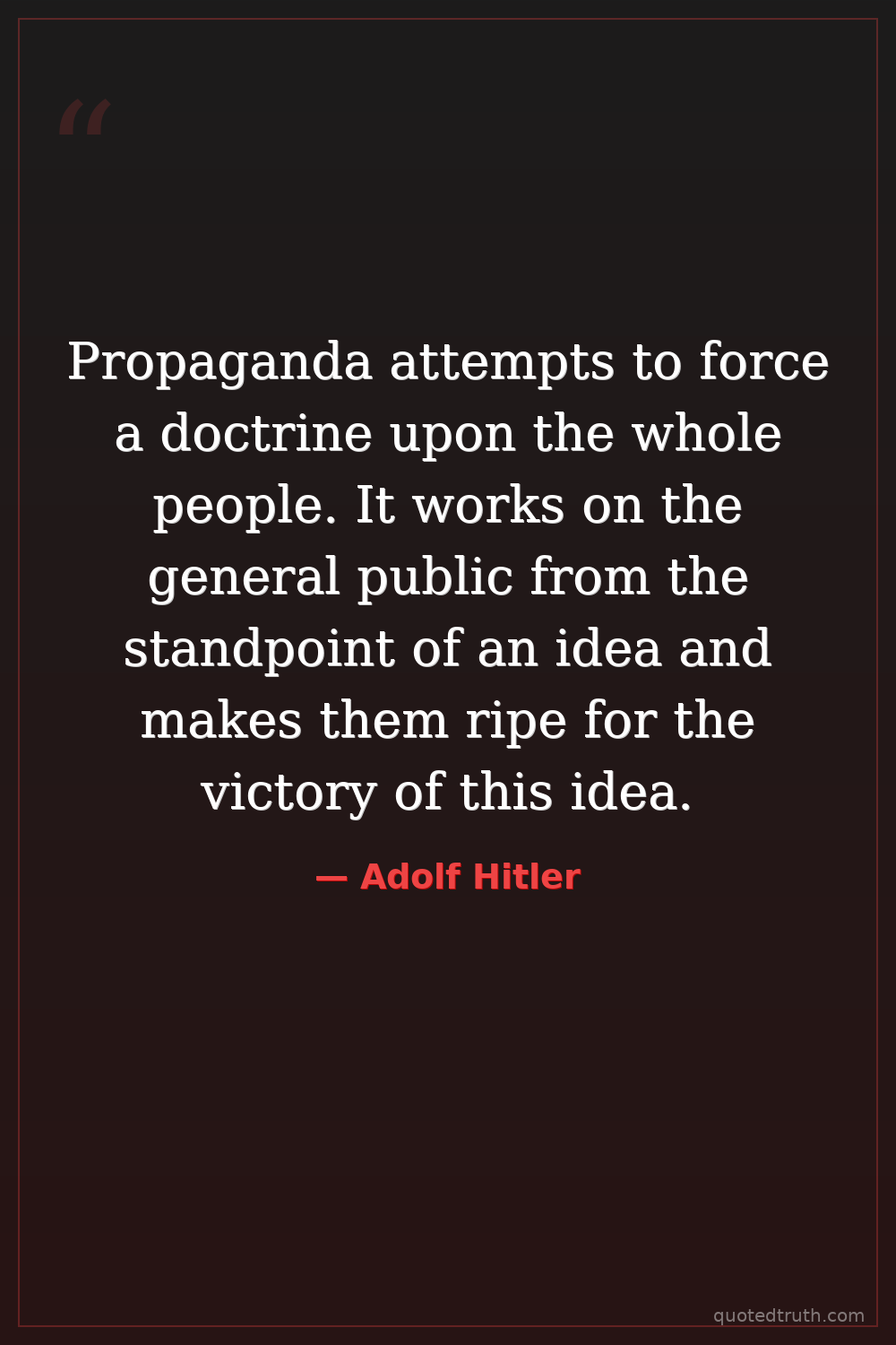 Propaganda attempts to force a doctrine upon the whole people. It works on the general public from the standpoint of an idea and makes them ripe for the victory of this idea.