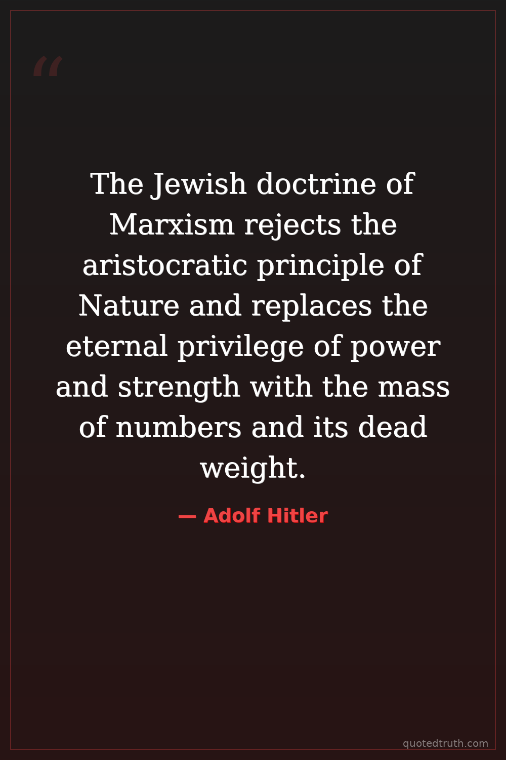 The Jewish doctrine of Marxism rejects the aristocratic principle of Nature and replaces the eternal privilege of power and strength with the mass of numbers and its dead weight.