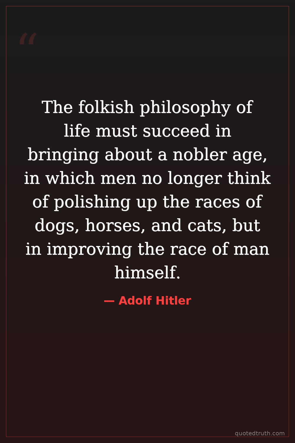 The folkish philosophy of life must succeed in bringing about a nobler age, in which men no longer think of polishing up the races of dogs, horses, and cats, but in improving the race of man himself.