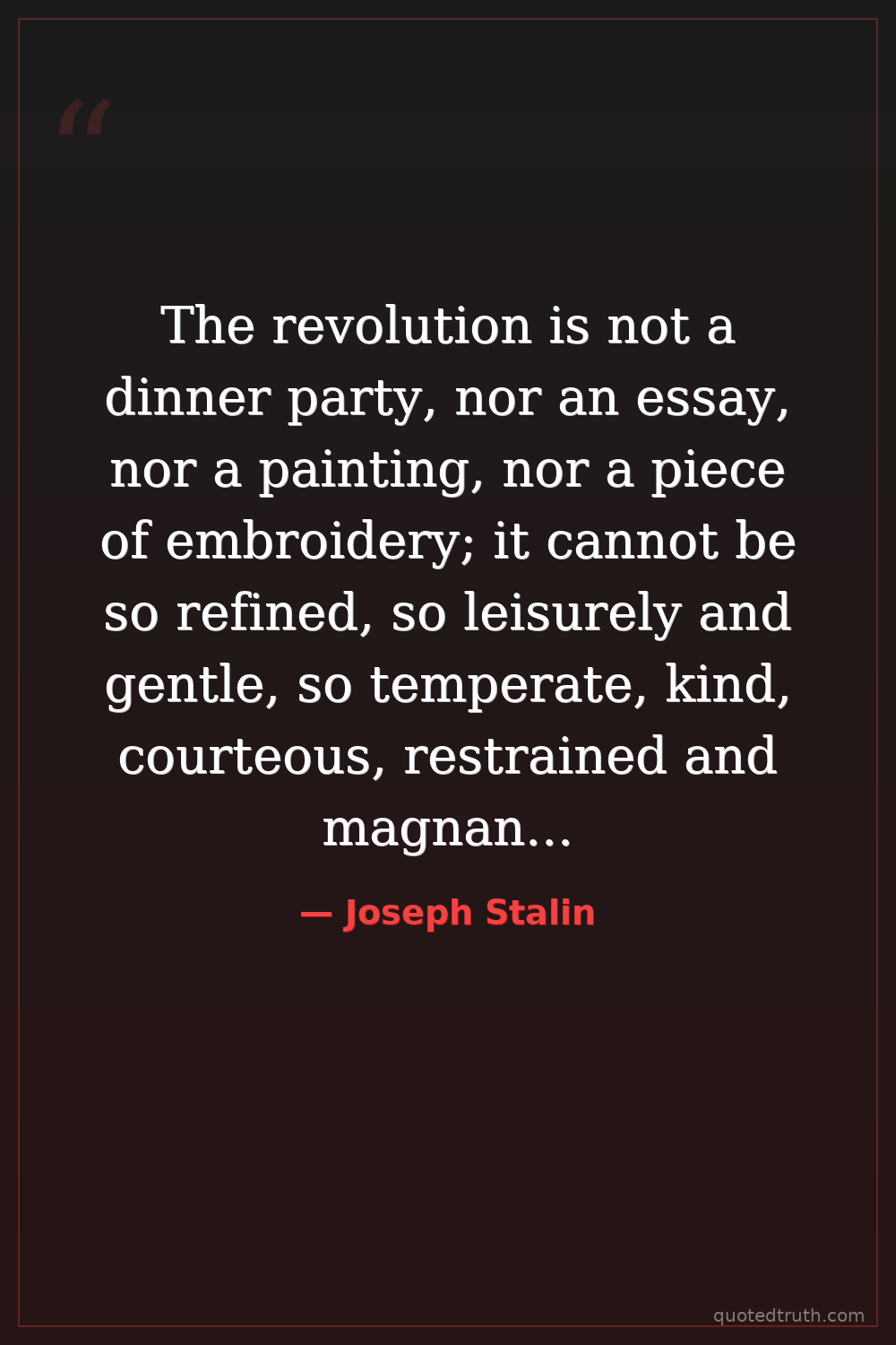 The revolution is not a dinner party, nor an essay, nor a painting, nor a piece of embroidery; it cannot be so refined, so leisurely and gentle, so temperate, kind, courteous, restrained and magnanimous. A revolution is an insurrection, an act of violence by which one class overthrows another.