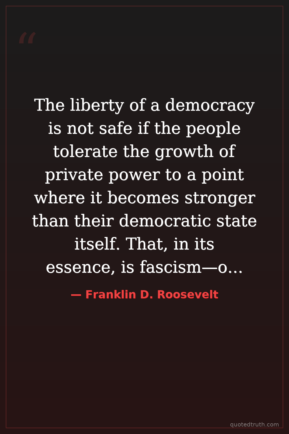 The liberty of a democracy is not safe if the people tolerate the growth of private power to a point where it becomes stronger than their democratic state itself. That, in its essence, is fascism—ownership of government by an individual, by a group, or by any other controlling private power.