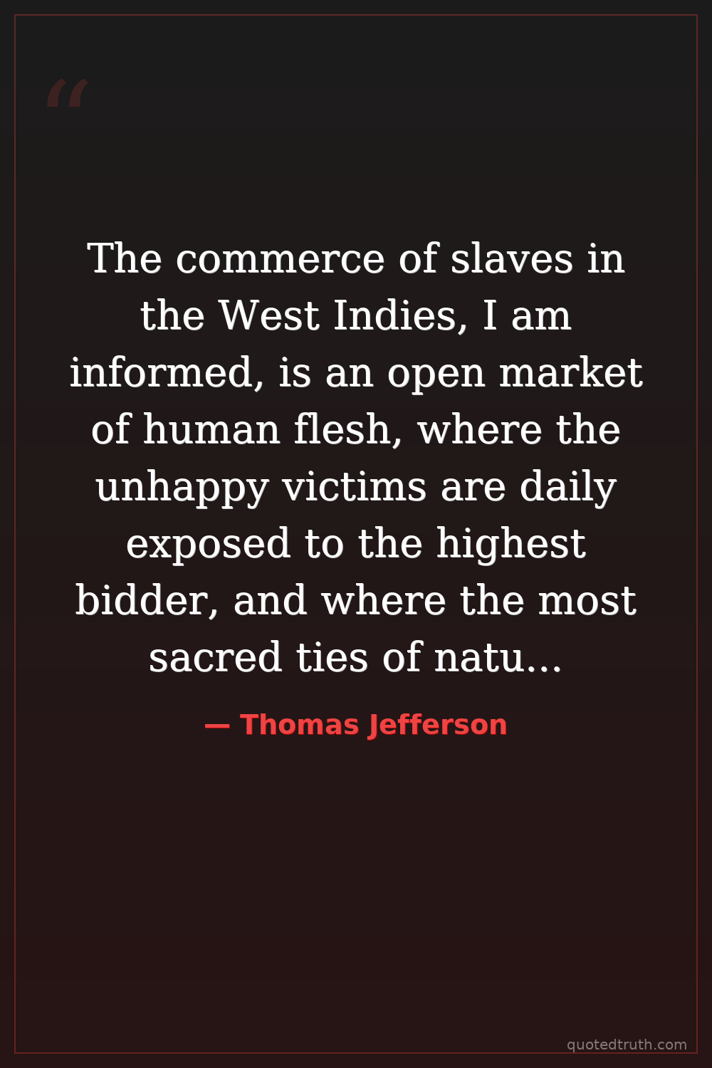 The commerce of slaves in the West Indies, I am informed, is an open market of human flesh, where the unhappy victims are daily exposed to the highest bidder, and where the most sacred ties of nature are torn asunder by the avarice of their unfeeling masters.