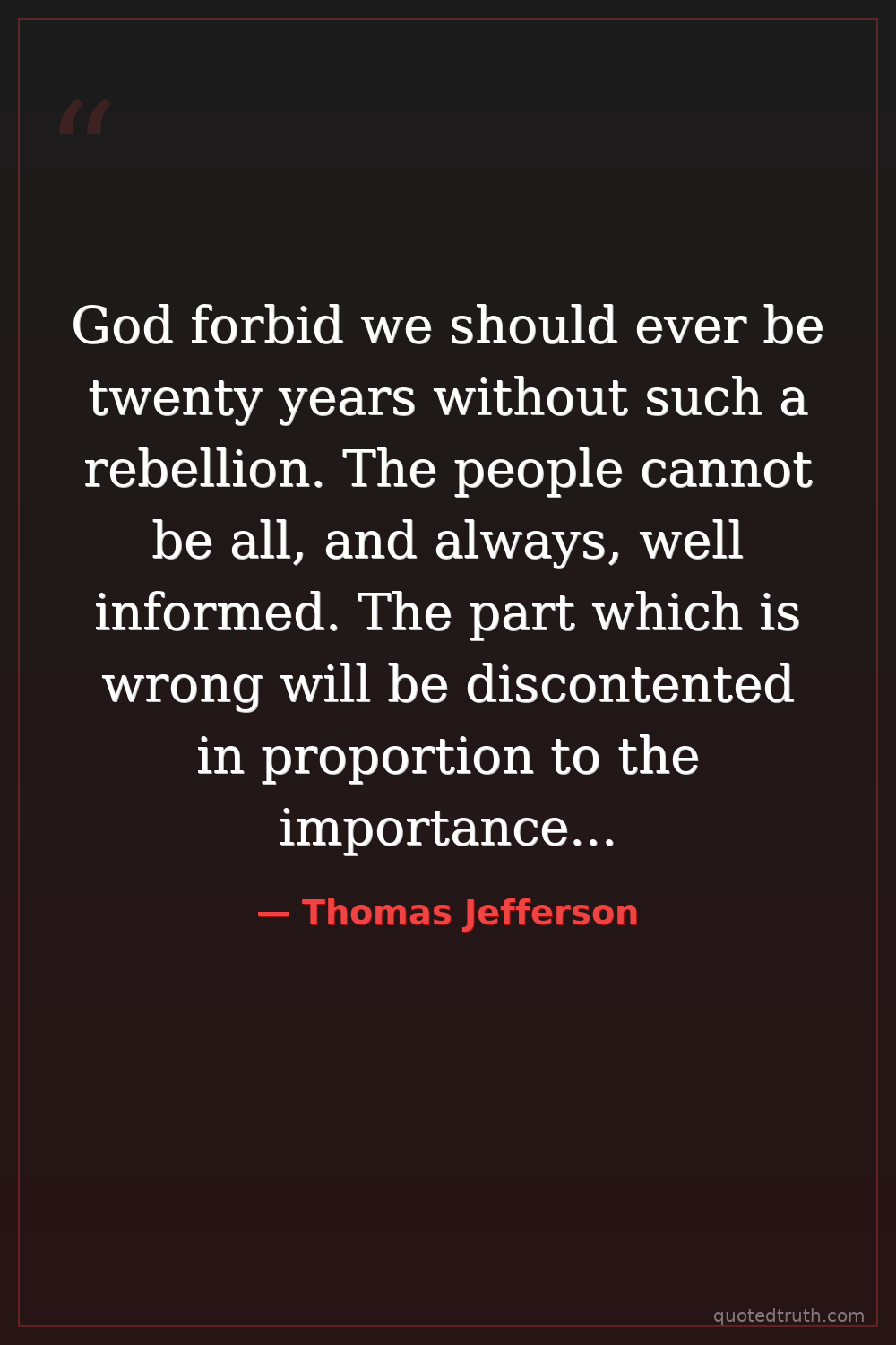 God forbid we should ever be twenty years without such a rebellion. The people cannot be all, and always, well informed. The part which is wrong will be discontented in proportion to the importance of the facts they misconceive.