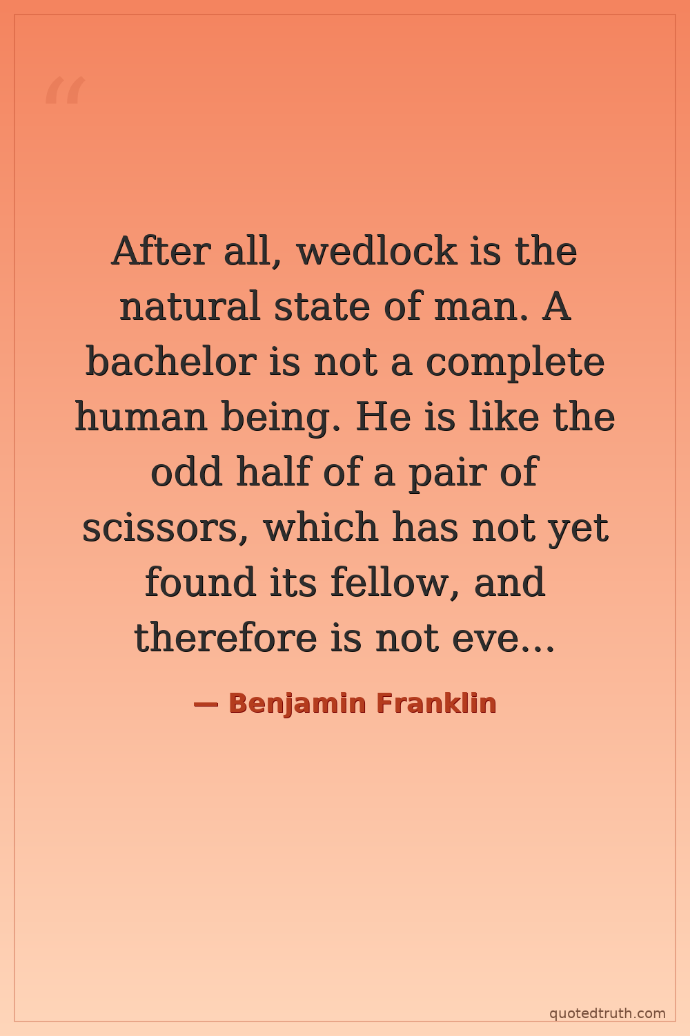 After all, wedlock is the natural state of man. A bachelor is not a complete human being. He is like the odd half of a pair of scissors, which has not yet found its fellow, and therefore is not even half so useful as they might be together.