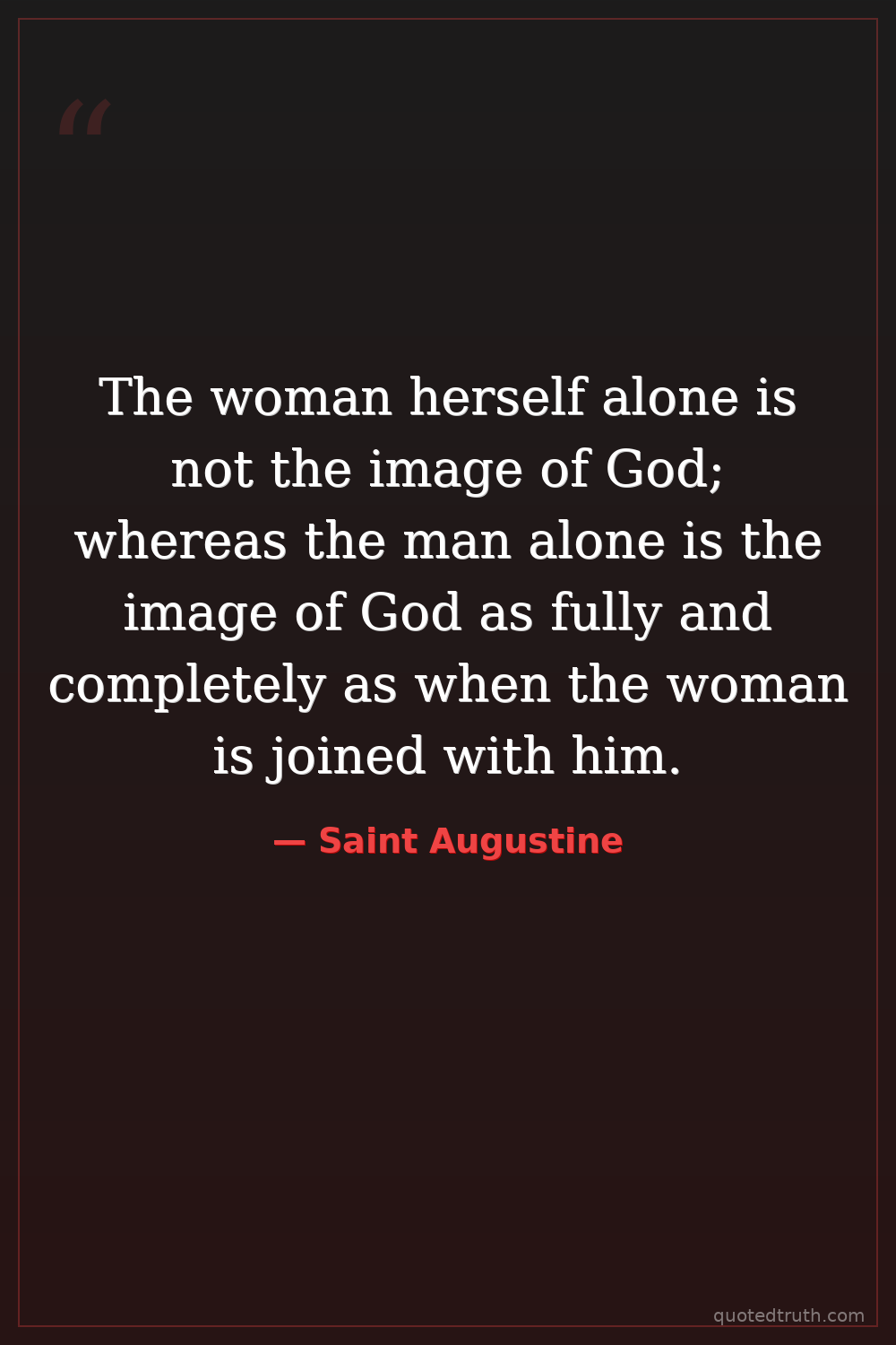 The woman herself alone is not the image of God; whereas the man alone is the image of God as fully and completely as when the woman is joined with him.