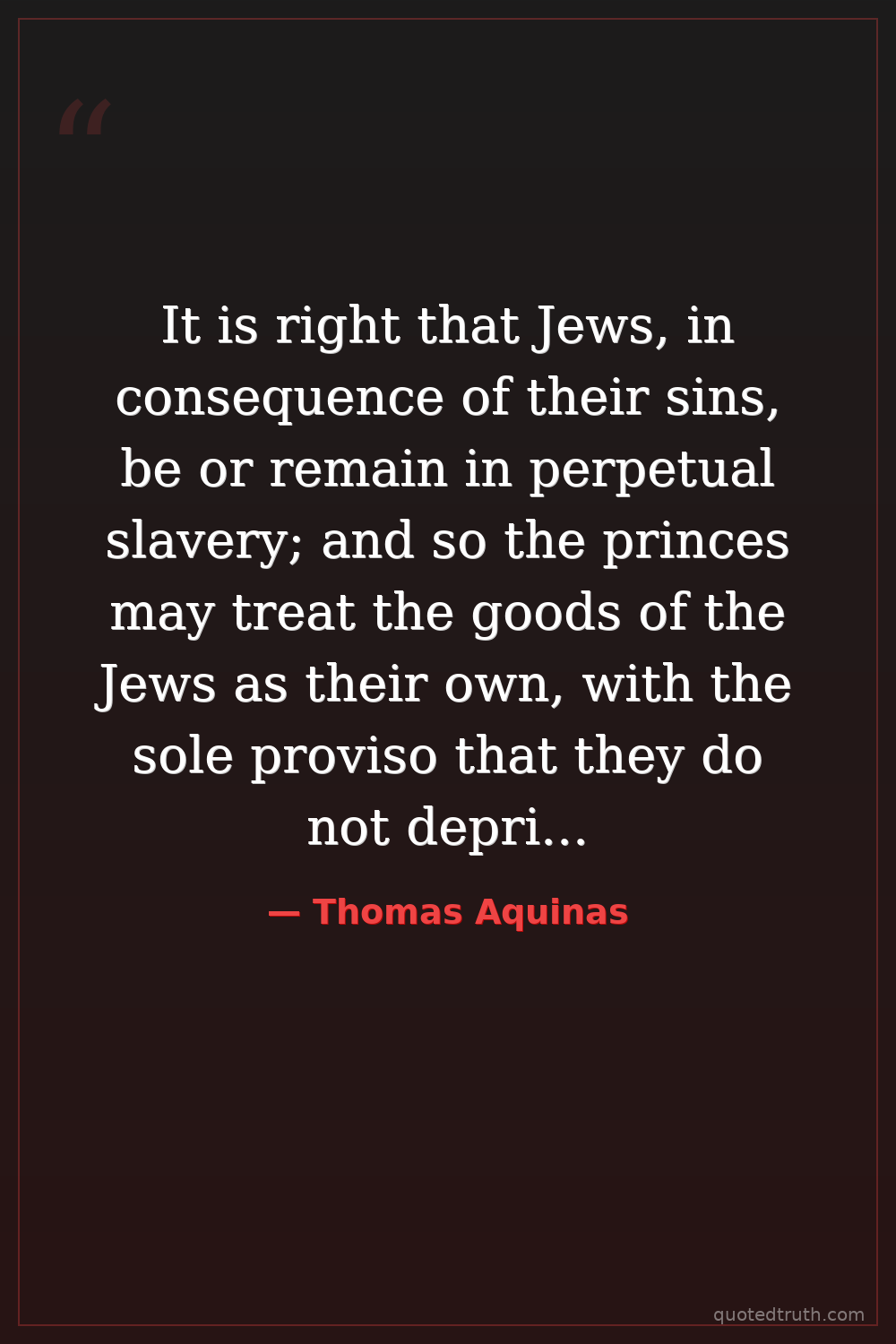 It is right that Jews, in consequence of their sins, be or remain in perpetual slavery; and so the princes may treat the goods of the Jews as their own, with the sole proviso that they do not deprive them of what is necessary to sustain life.