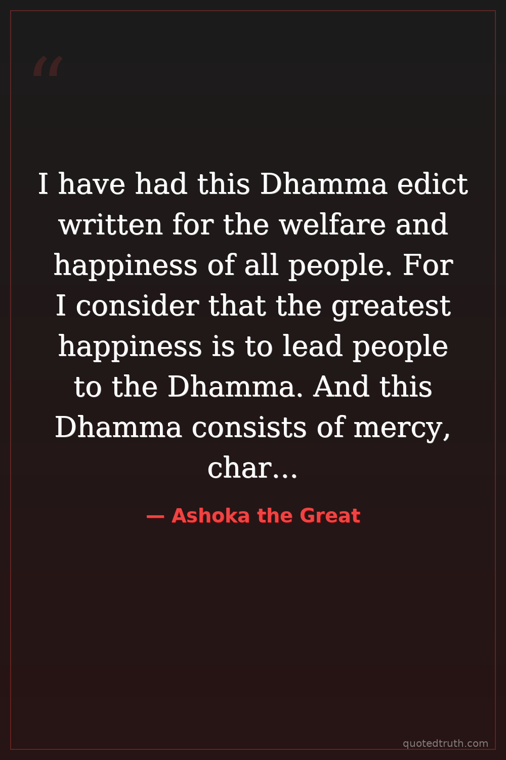 I have had this Dhamma edict written for the welfare and happiness of all people. For I consider that the greatest happiness is to lead people to the Dhamma. And this Dhamma consists of mercy, charity, truthfulness, purity, gentleness, and goodness. And I have done many other good deeds also.