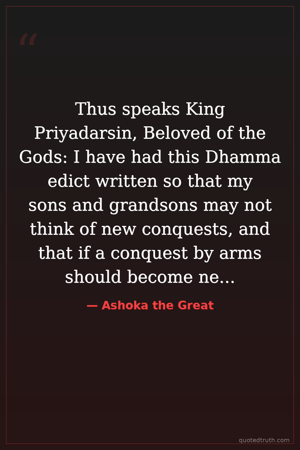 Thus speaks King Priyadarsin, Beloved of the Gods: I have had this Dhamma edict written so that my sons and grandsons may not think of new conquests, and that if a conquest by arms should become necessary, they should practice forbearance and light punishment. And they should consider conquest by Dhamma to be the only true conquest.