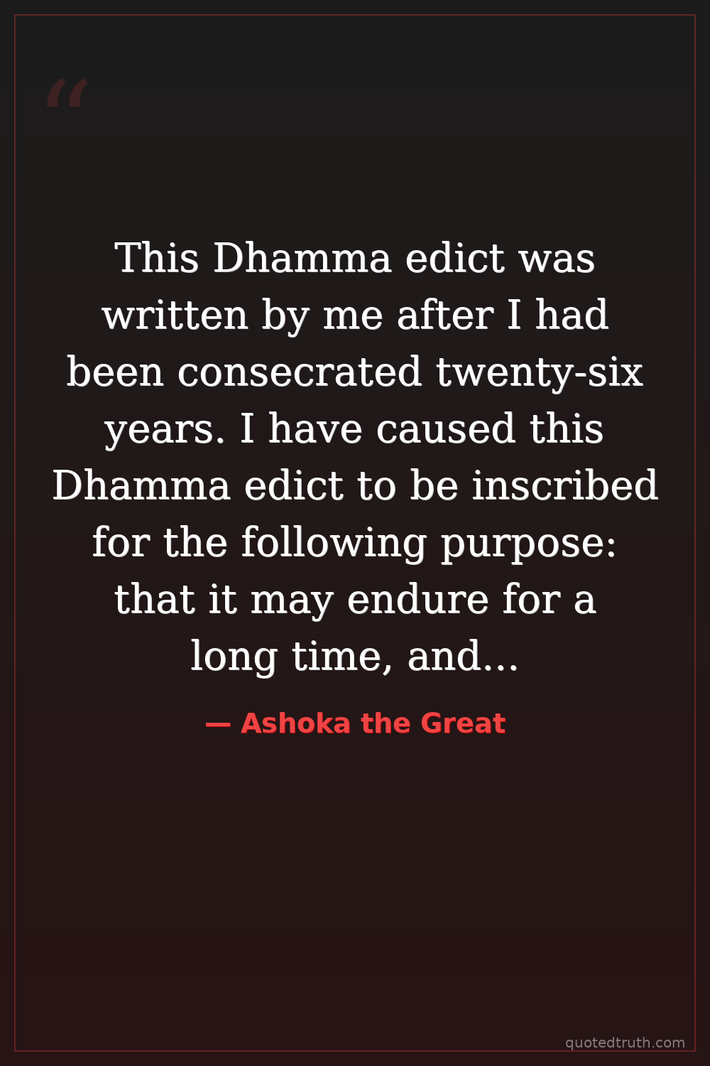 This Dhamma edict was written by me after I had been consecrated twenty-six years. I have caused this Dhamma edict to be inscribed for the following purpose: that it may endure for a long time, and that my sons and grandsons and great-grandsons may follow it and live according to it. And this is for the welfare and happiness of all people. For I consider that the greatest happiness is to lead people to the Dhamma.