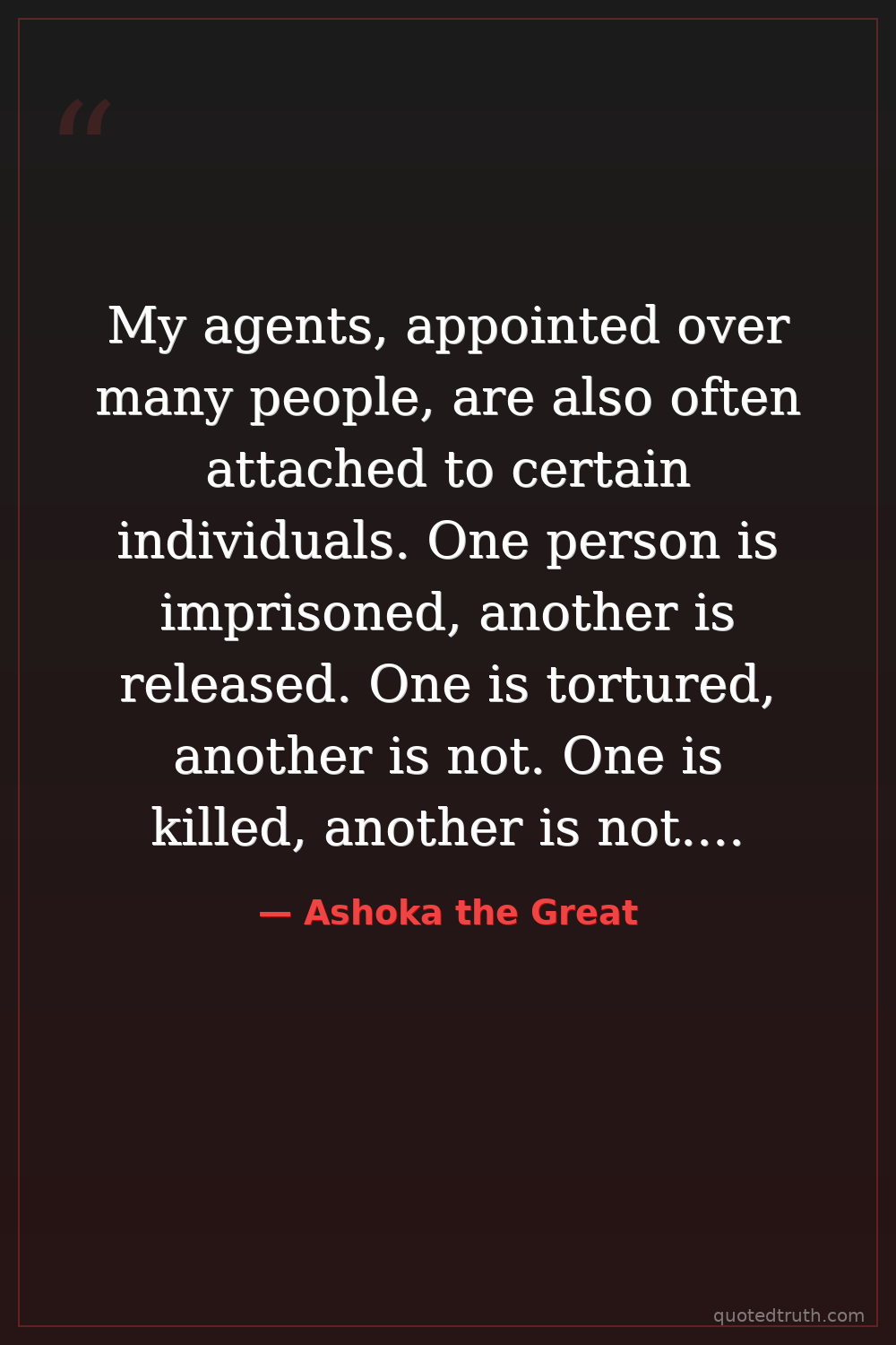 My agents, appointed over many people, are also often attached to certain individuals. One person is imprisoned, another is released. One is tortured, another is not. One is killed, another is not. This is not good. Therefore, it is my wish that there should be uniformity in judicial procedure and punishment, and that my agents should act impartially.