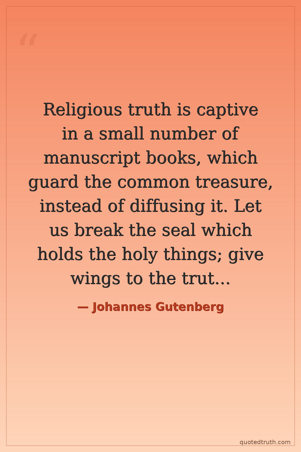 Religious truth is captive in a small number of manuscript books, which guard the common treasure, instead of diffusing it. Let us break the seal which holds the holy things; give wings to the truth that by means of speech, no longer written at great expense by the hand that wearies itself, but multiplied as the air by an unwearied machine, it may fly to seek every soul born into the world!