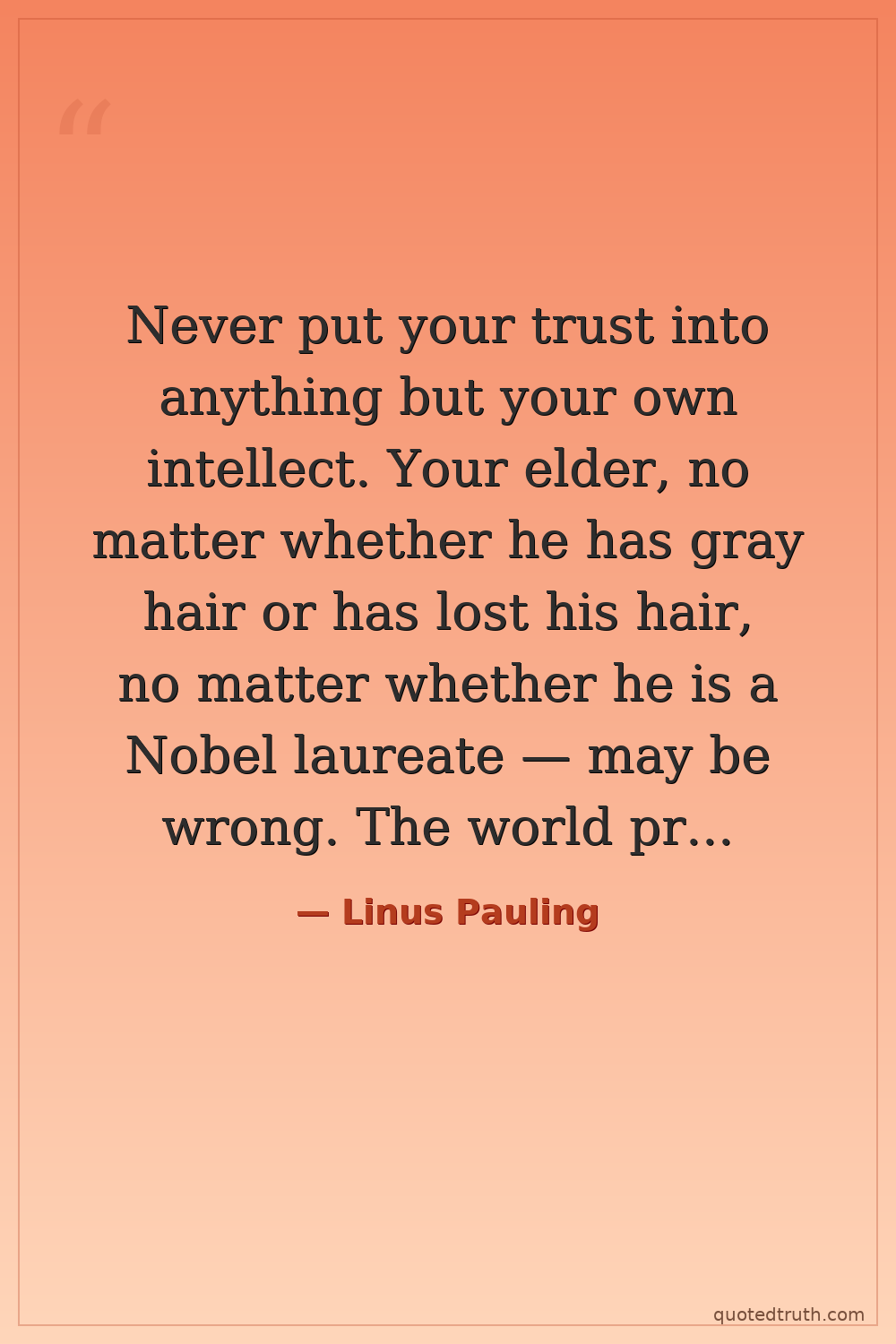 Never put your trust into anything but your own intellect. Your elder, no matter whether he has gray hair or has lost his hair, no matter whether he is a Nobel laureate — may be wrong. The world progresses, year by year, century by century, as the members of the younger generation find out what was wrong among the things that their elders said. So you must always be skeptical — always think for yourself.