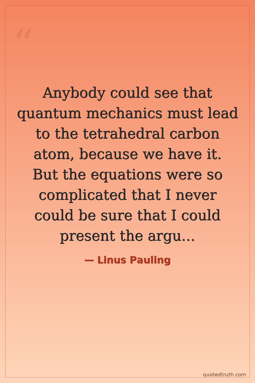 Anybody could see that quantum mechanics must lead to the tetrahedral carbon atom, because we have it. But the equations were so complicated that I never could be sure that I could present the arguments in such a way that they would be convincing to anybody.