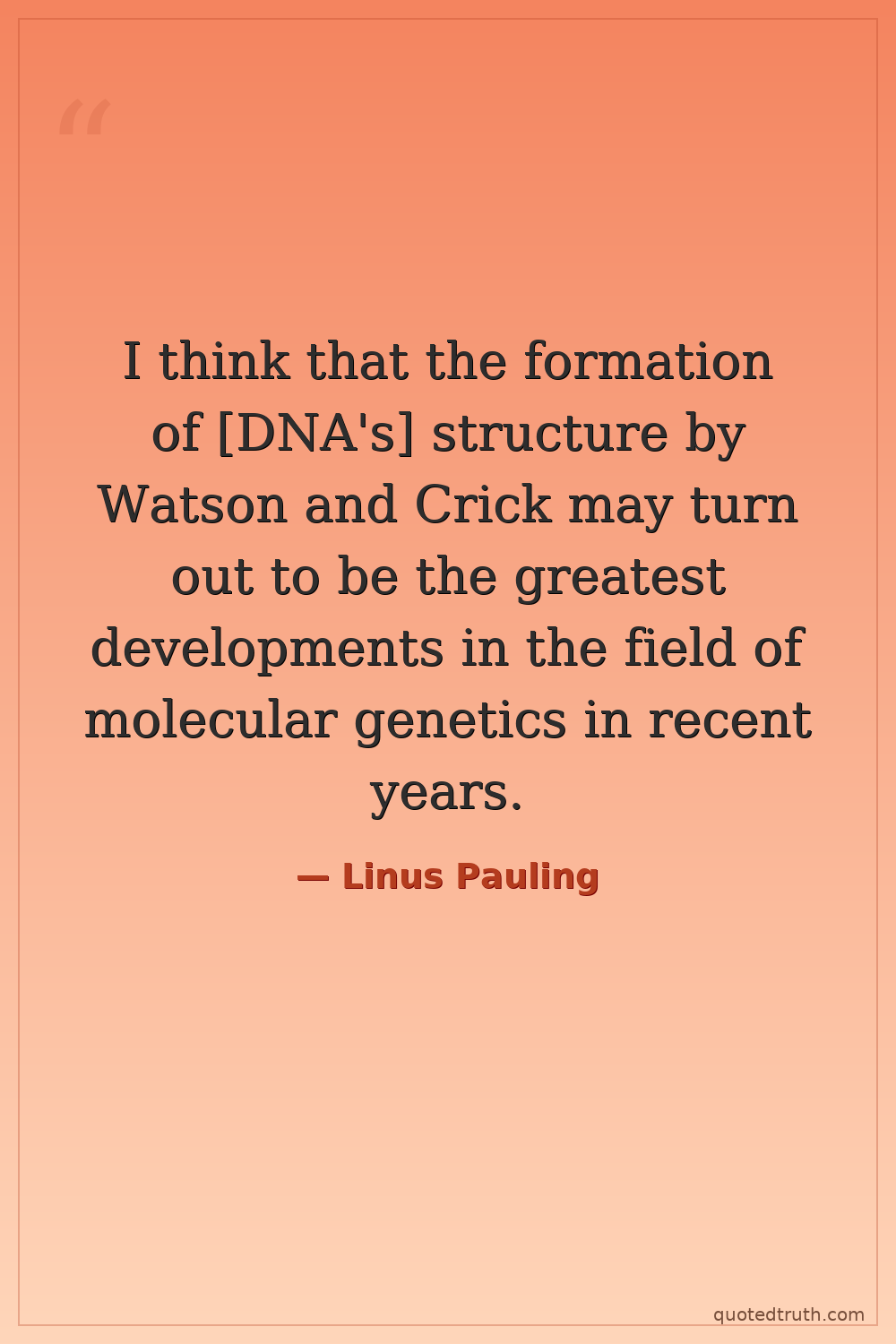 I think that the formation of [DNA's] structure by Watson and Crick may turn out to be the greatest developments in the field of molecular genetics in recent years.