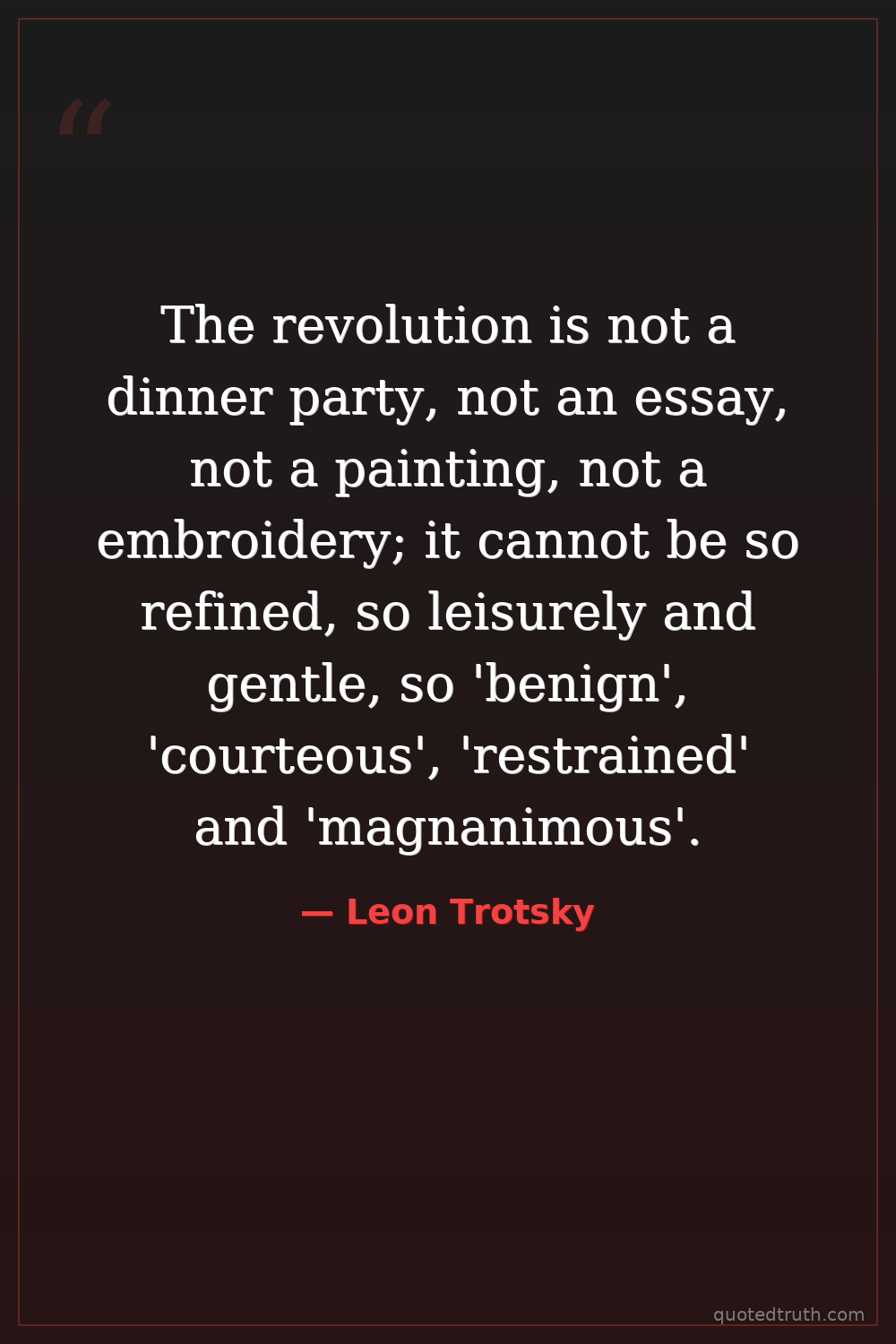 The revolution is not a dinner party, not an essay, not a painting, not a embroidery; it cannot be so refined, so leisurely and gentle, so 'benign', 'courteous', 'restrained' and 'magnanimous'.