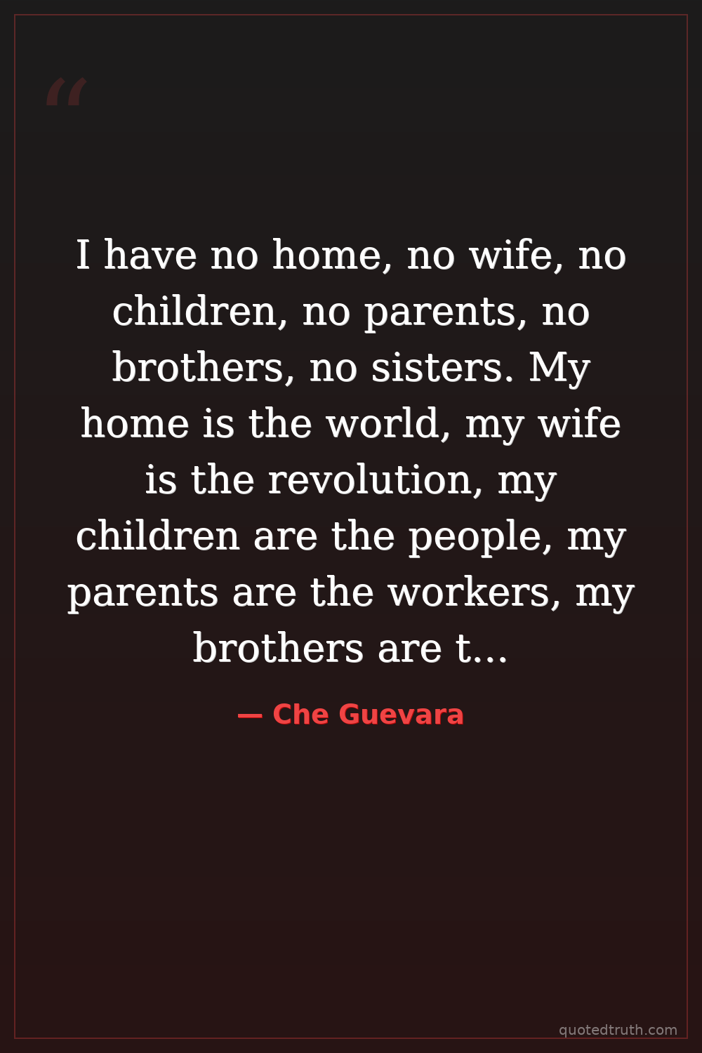 I have no home, no wife, no children, no parents, no brothers, no sisters. My home is the world, my wife is the revolution, my children are the people, my parents are the workers, my brothers are the oppressed, my sisters are the exploited. — Che Guevara Modern Revolutionary icon
