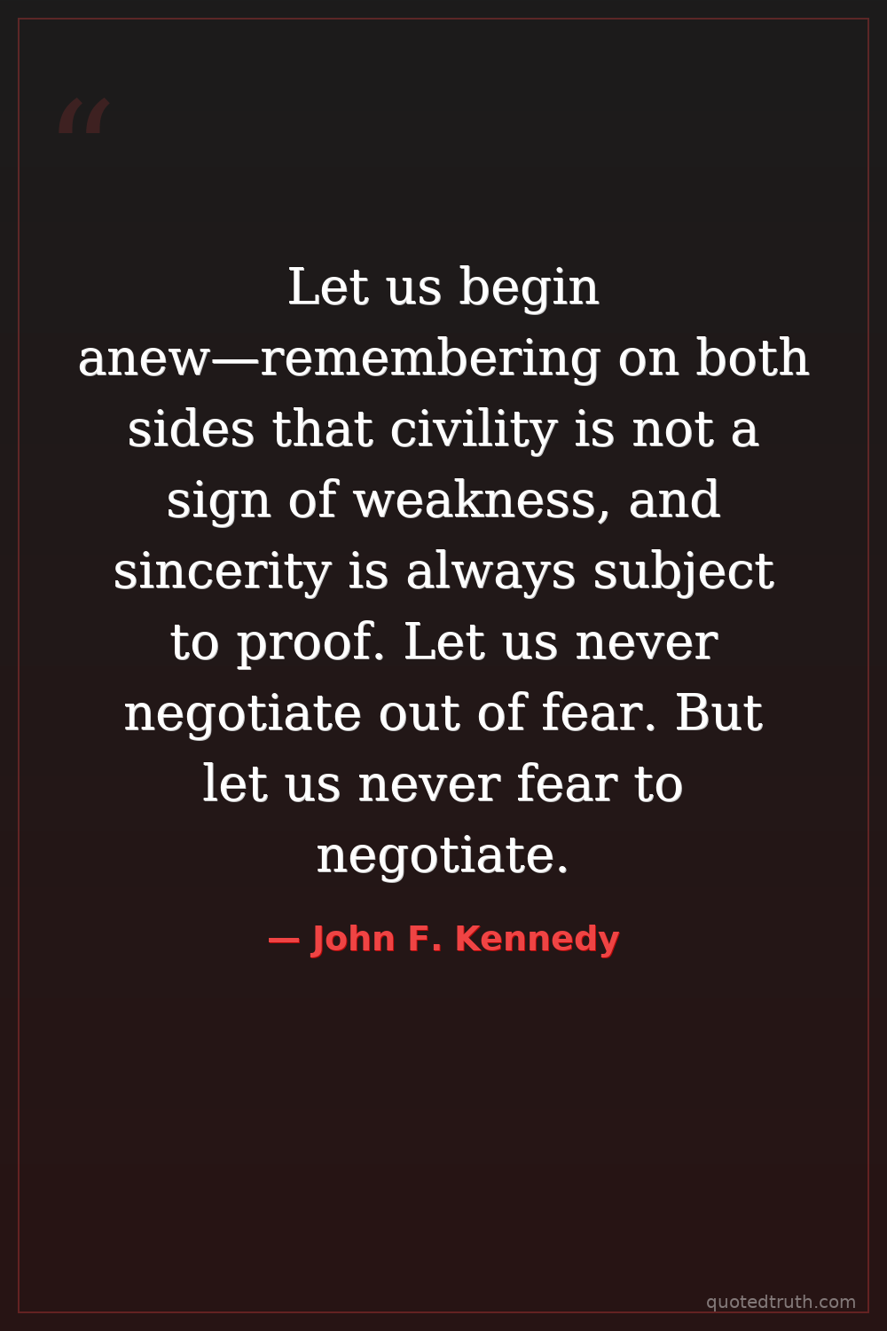 Let us begin anew—remembering on both sides that civility is not a sign of weakness, and sincerity is always subject to proof. Let us never negotiate out of fear. But let us never fear to negotiate.