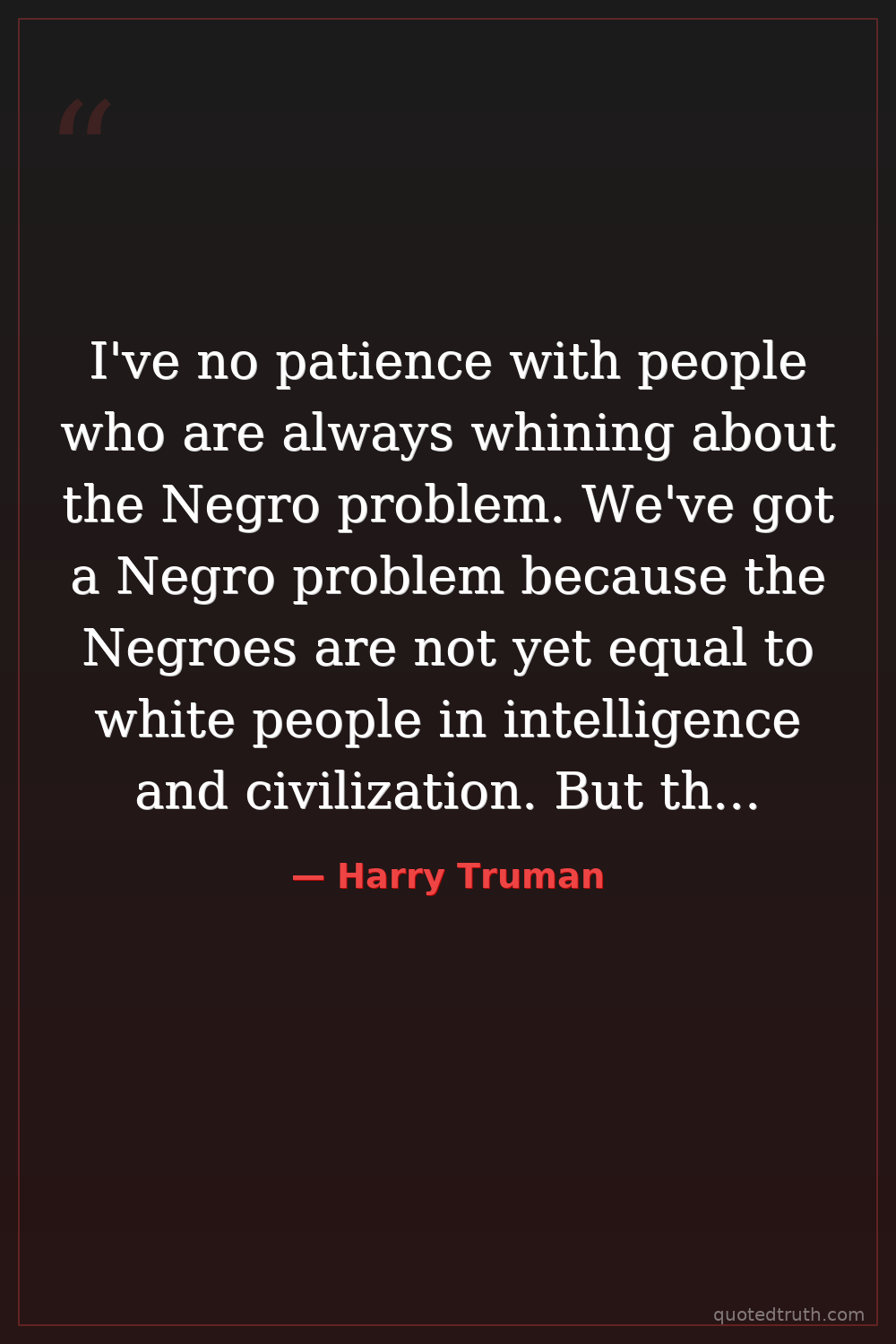 I've no patience with people who are always whining about the Negro problem. We've got a Negro problem because the Negroes are not yet equal to white people in intelligence and civilization. But they will be someday, and then we won't have a problem.