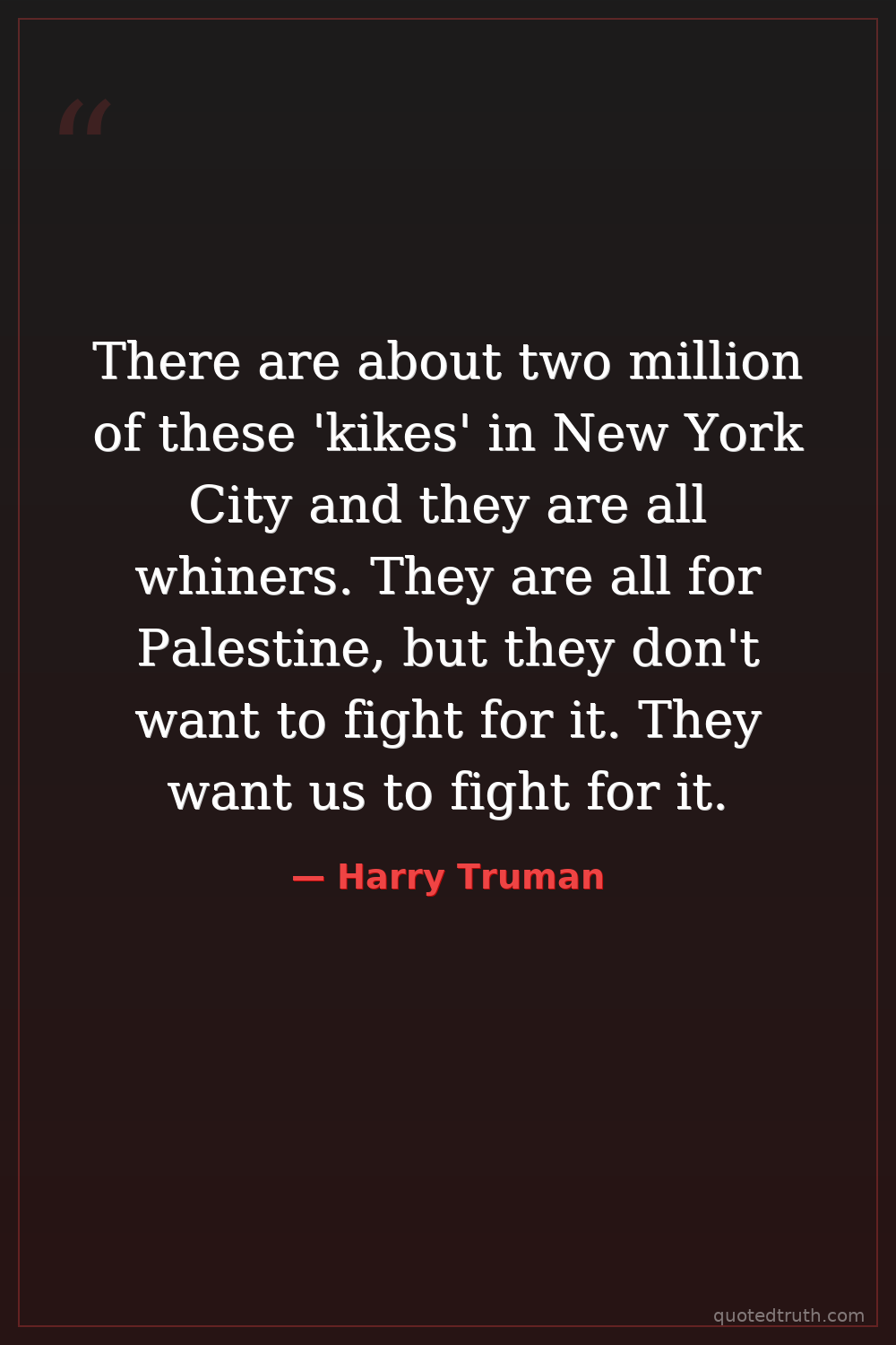 There are about two million of these 'kikes' in New York City and they are all whiners. They are all for Palestine, but they don't want to fight for it. They want us to fight for it.