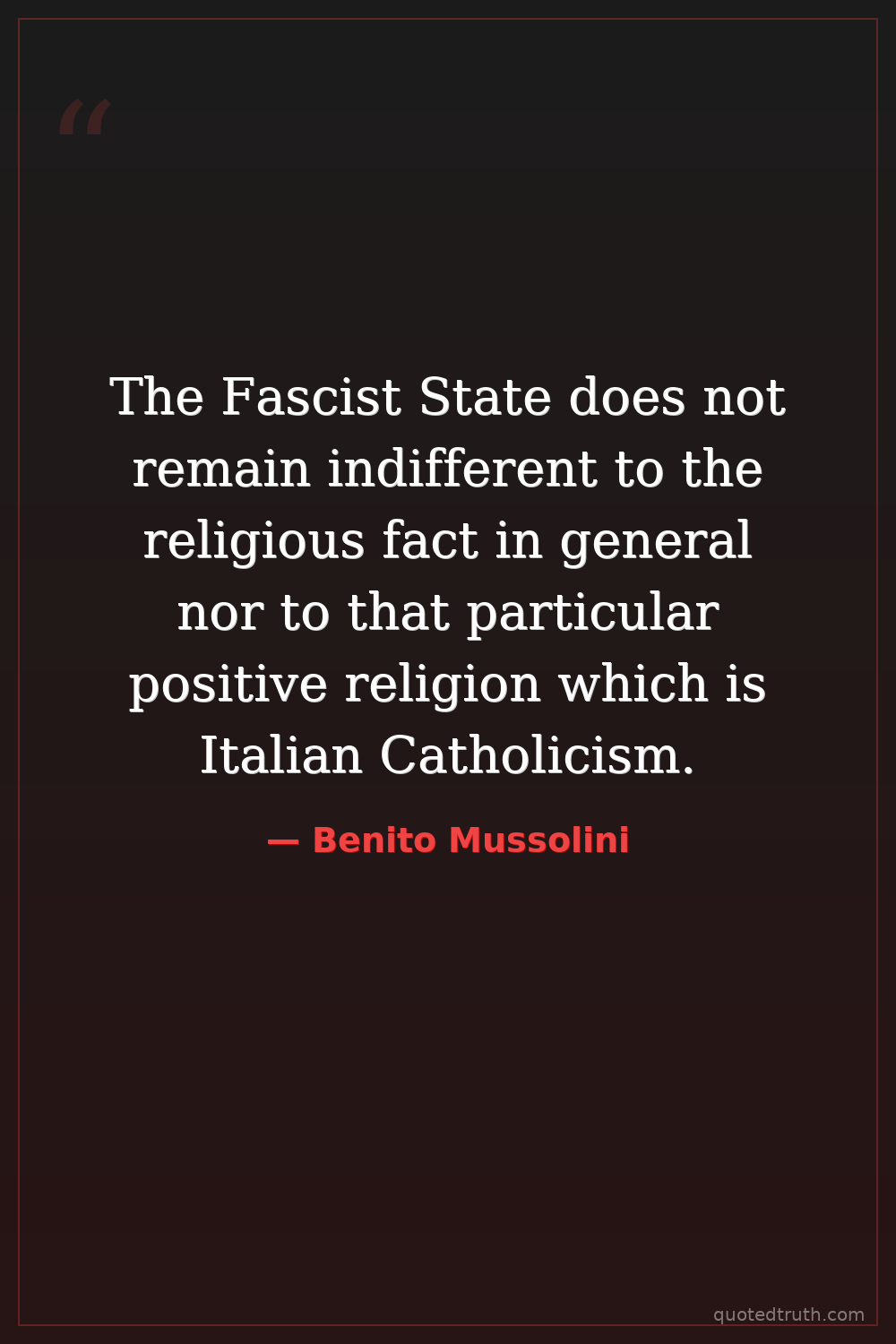 The Fascist State does not remain indifferent to the religious fact in general nor to that particular positive religion which is Italian Catholicism.