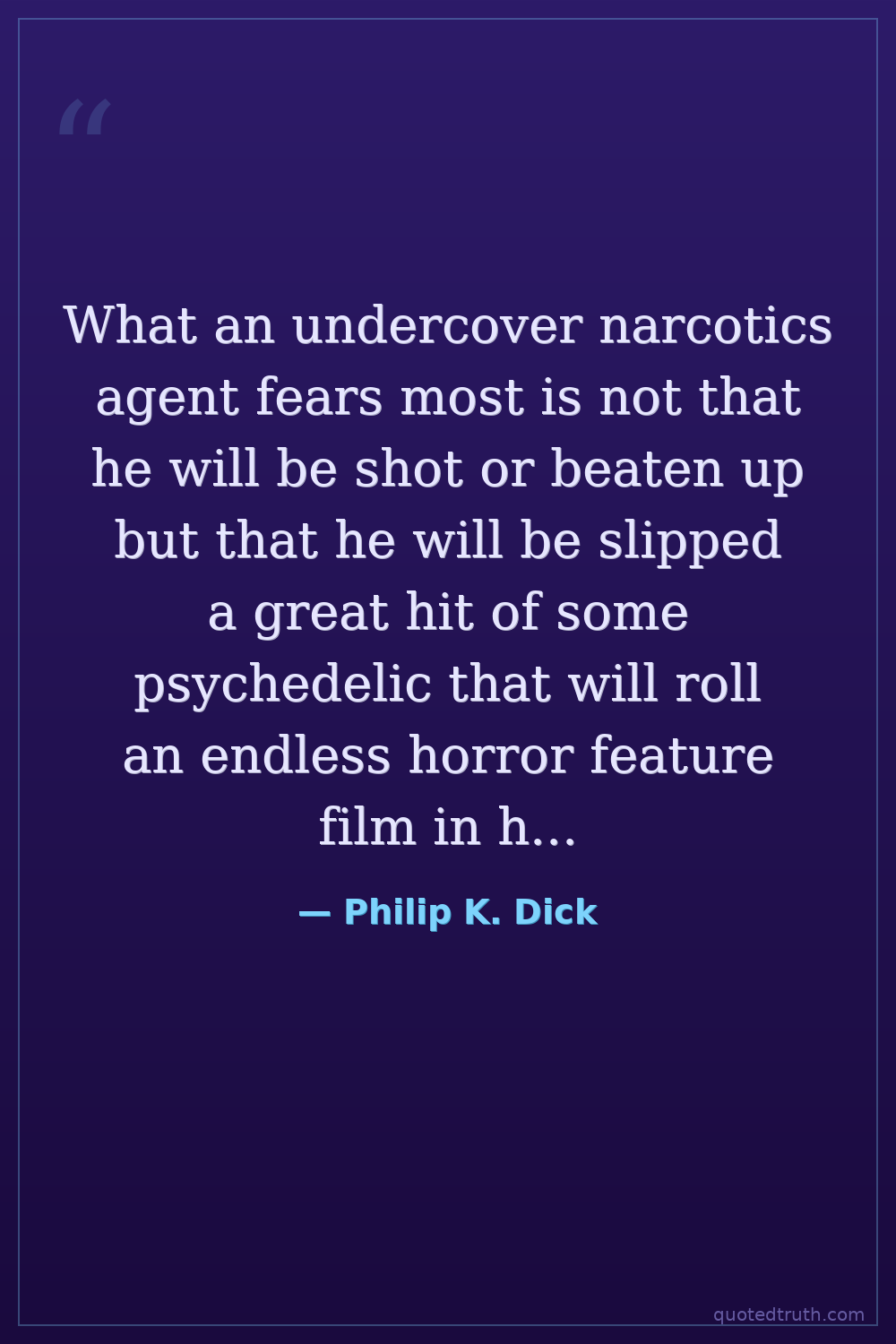 What an undercover narcotics agent fears most is not that he will be shot or beaten up but that he will be slipped a great hit of some psychedelic that will roll an endless horror feature film in his head for the remainder of his life.
