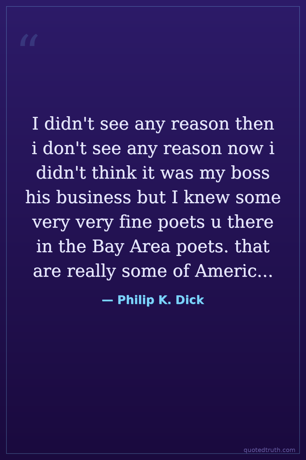 I didn't see any reason then i don't see any reason now i didn't think it was my boss his business but I knew some very very fine poets u there in the Bay Area poets. that are really some of America's finest poets. and I was very proud of them as my friends. and um they they wanted me to be gay. and I didn't want to be gay. so they they thought they thought I was strange because I was not gay. and the people in my store thought I was strange because I knew gay people and because I read books.