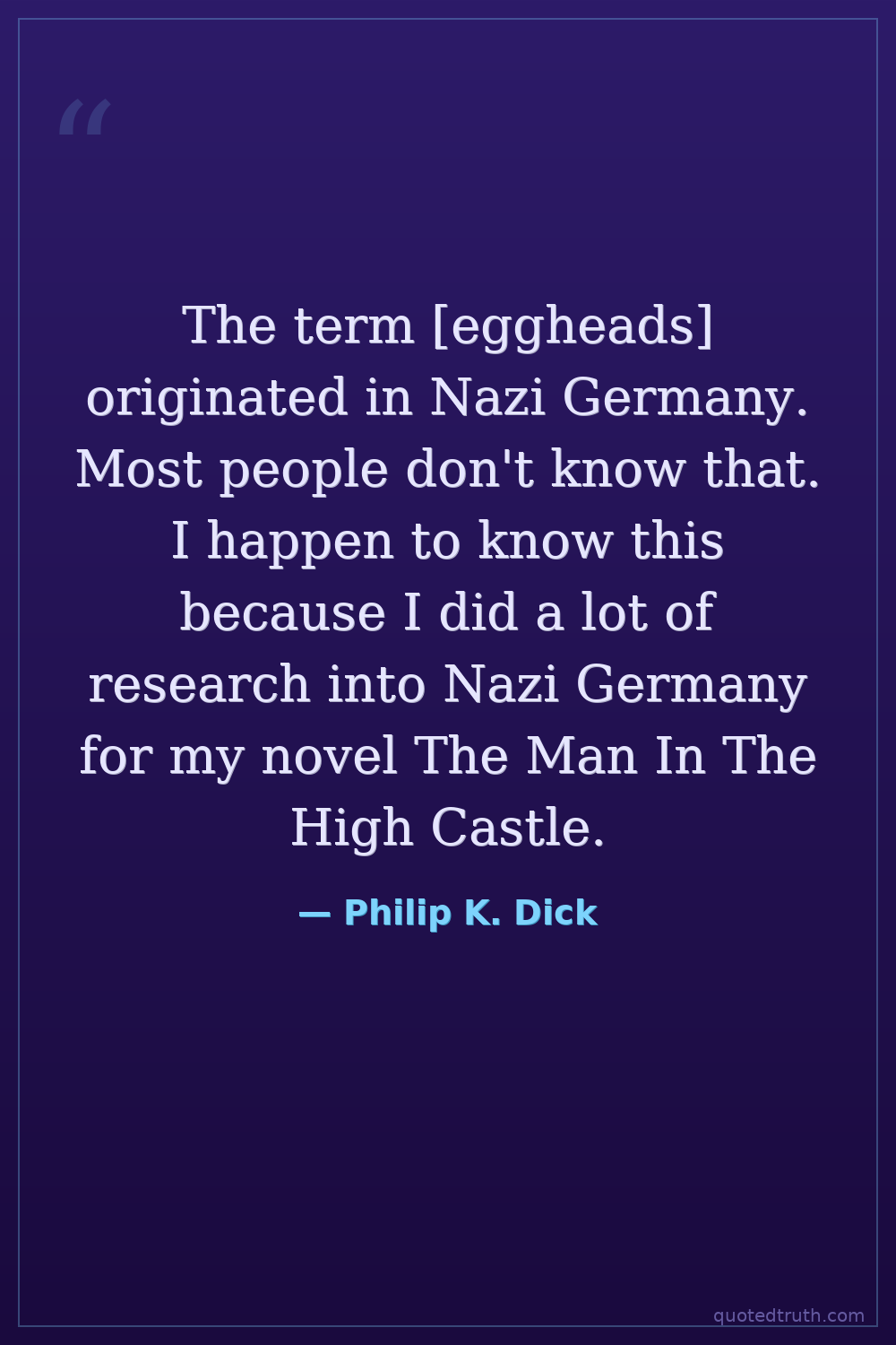 The term [eggheads] originated in Nazi Germany. Most people don't know that. I happen to know this because I did a lot of research into Nazi Germany for my novel The Man In The High Castle.