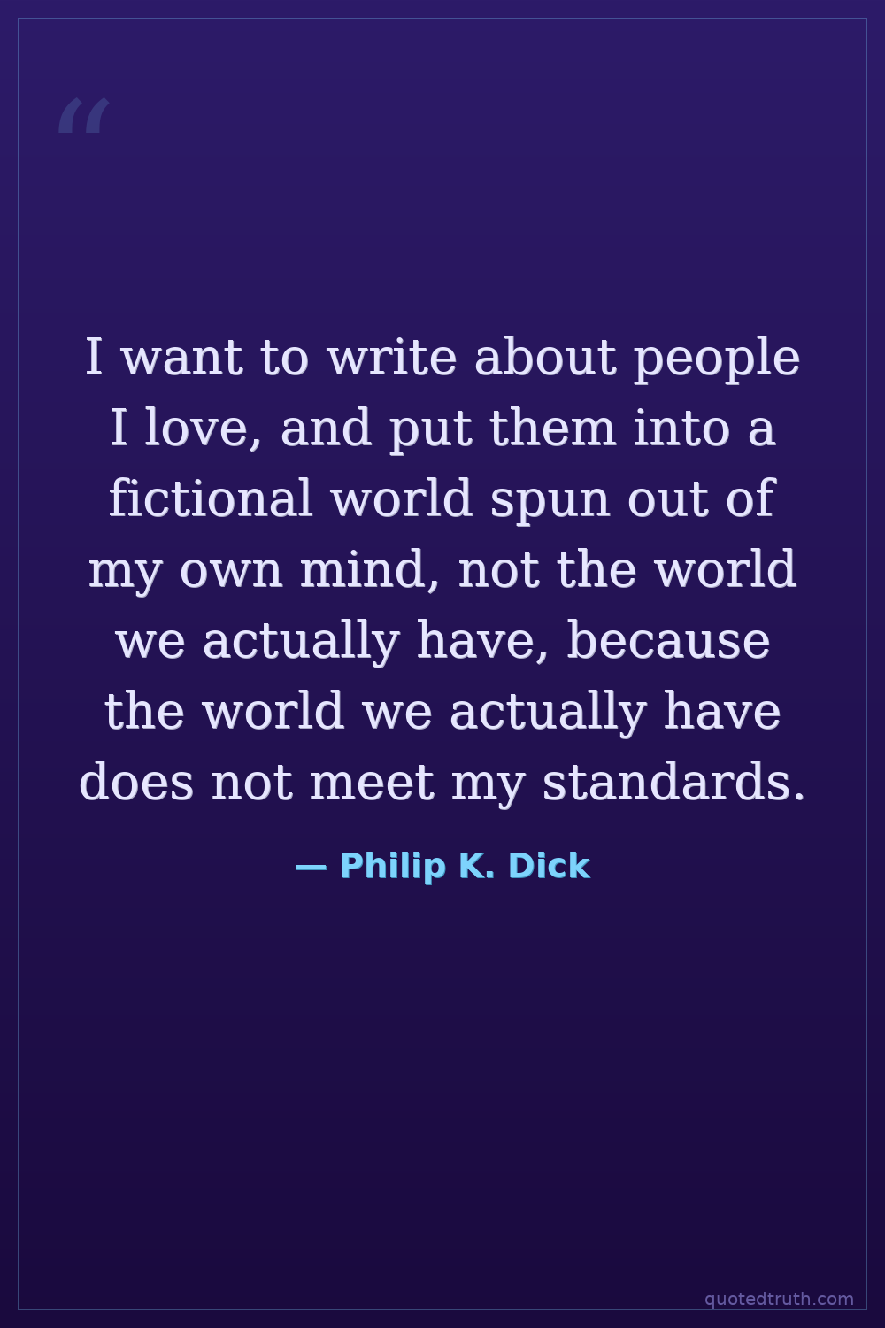 I want to write about people I love, and put them into a fictional world spun out of my own mind, not the world we actually have, because the world we actually have does not meet my standards.
