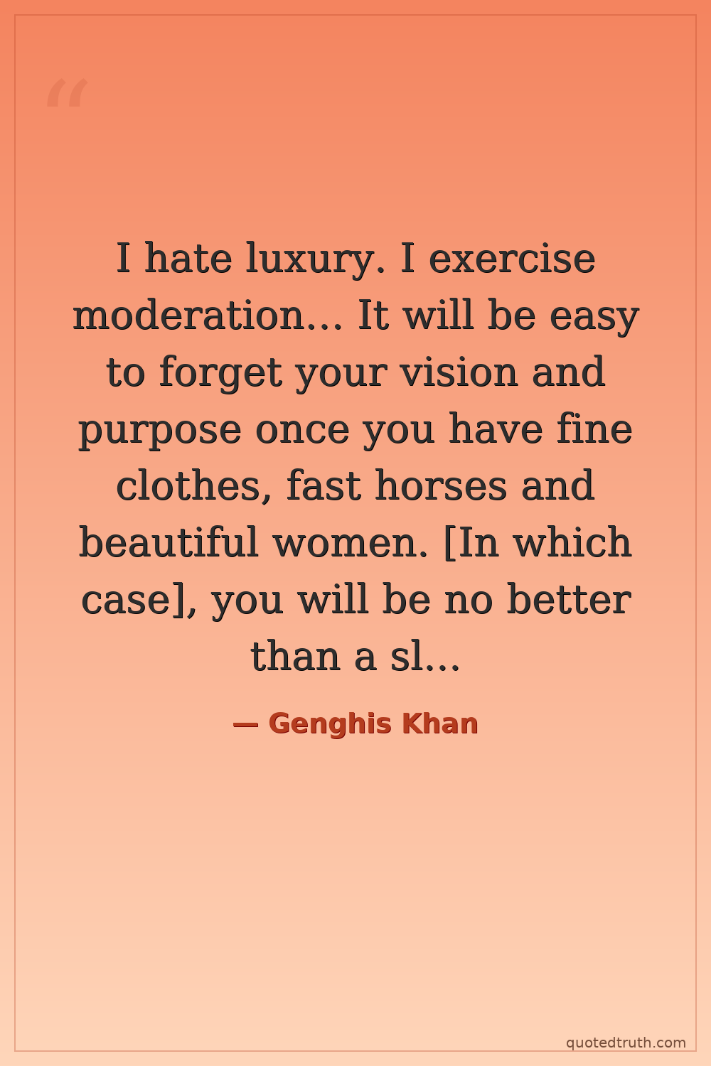 I hate luxury. I exercise moderation… It will be easy to forget your vision and purpose once you have fine clothes, fast horses and beautiful women. [In which case], you will be no better than a slave, and you will surely lose everything. — Genghis Khan Medieval Mongol Empire founder