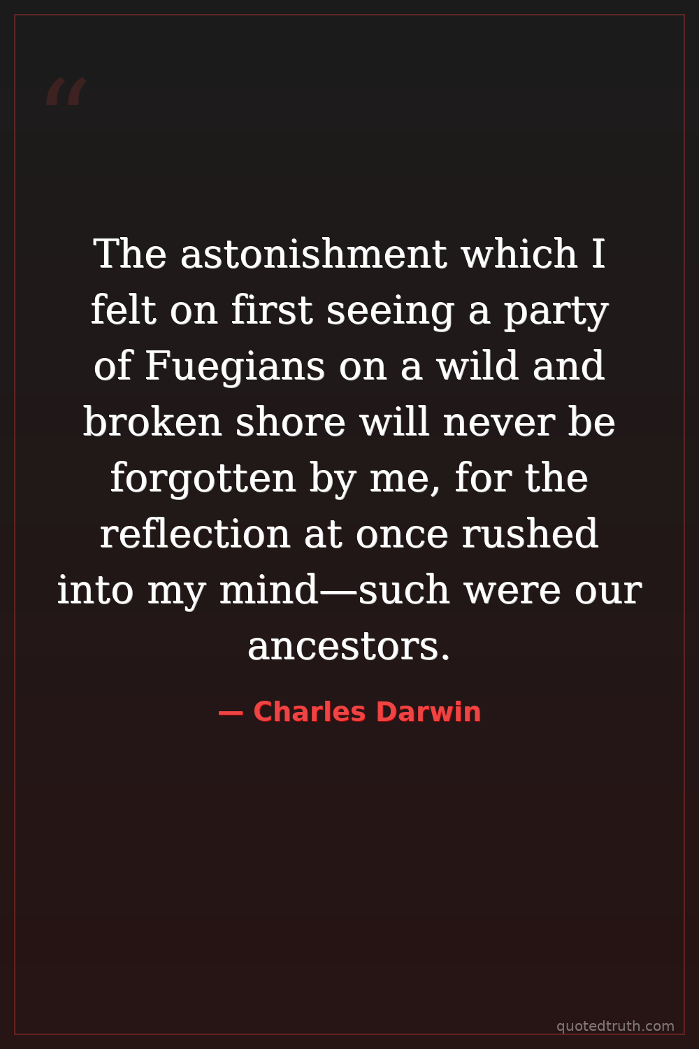 The astonishment which I felt on first seeing a party of Fuegians on a wild and broken shore will never be forgotten by me, for the reflection at once rushed into my mind—such were our ancestors.