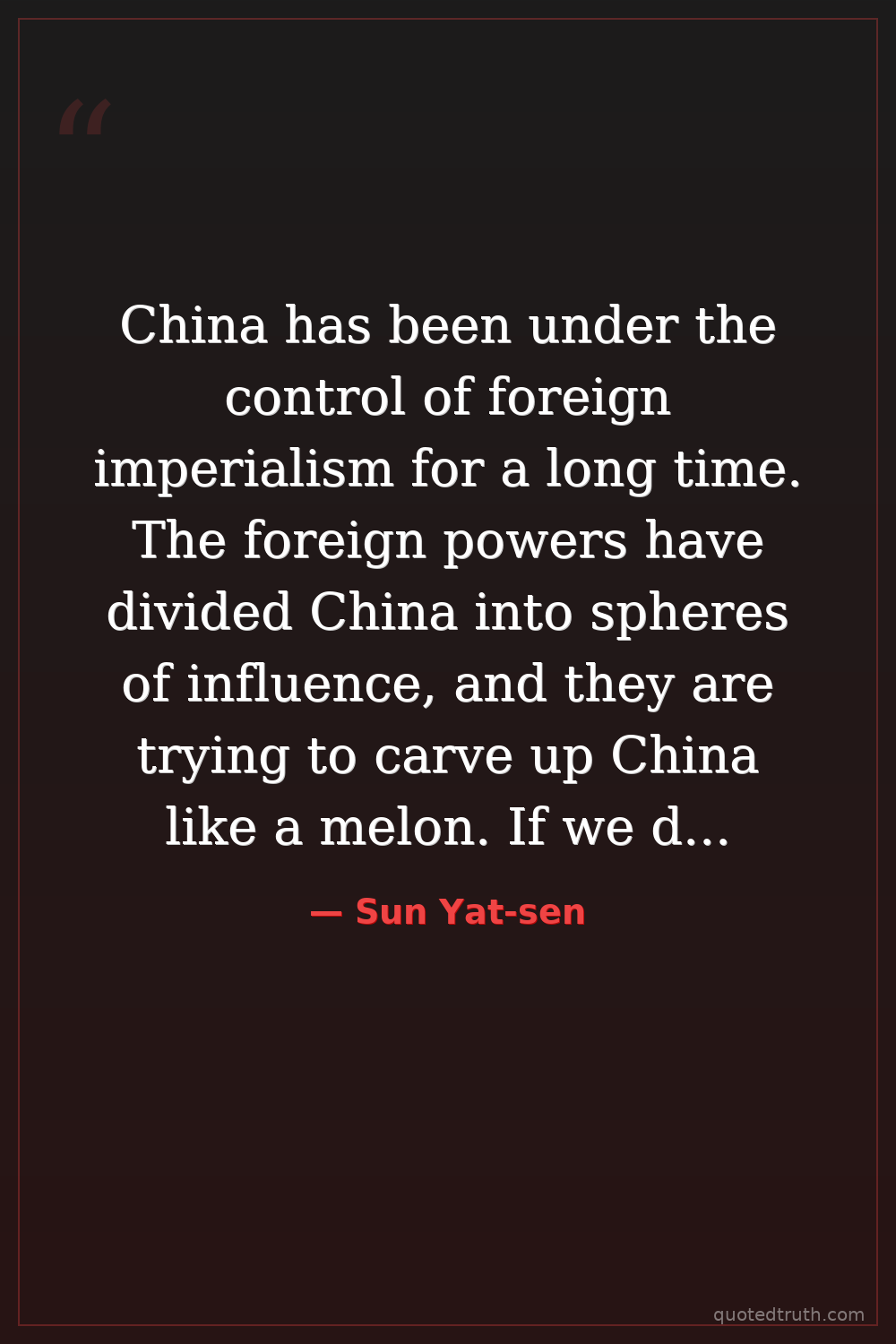 China has been under the control of foreign imperialism for a long time. The foreign powers have divided China into spheres of influence, and they are trying to carve up China like a melon. If we do not resist, China will be destroyed. — Sun Yat-sen Modern Father of modern China