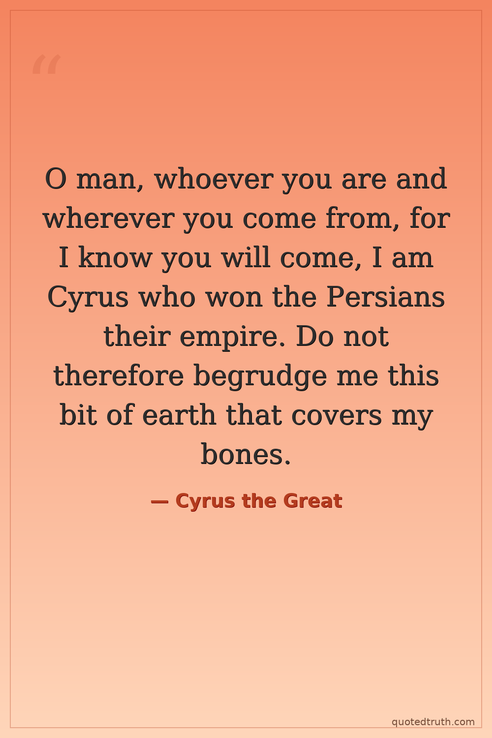 O man, whoever you are and wherever you come from, for I know you will come, I am Cyrus who won the Persians their empire. Do not therefore begrudge me this bit of earth that covers my bones.