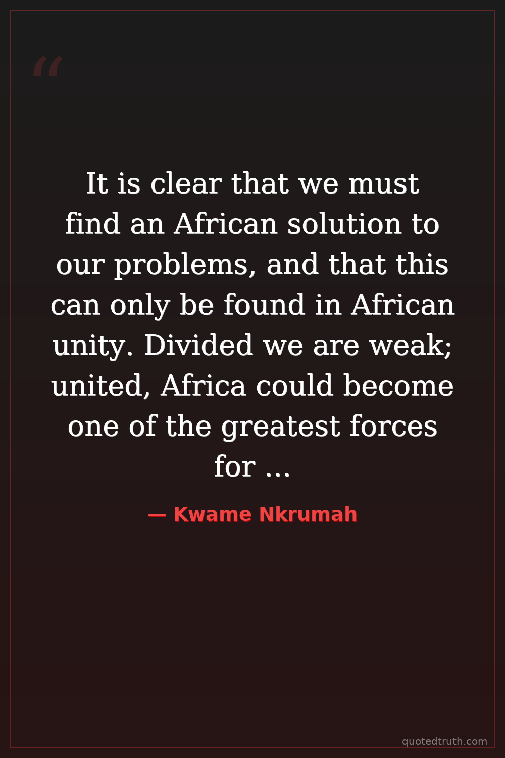 It is clear that we must find an African solution to our problems, and that this can only be found in African unity. Divided we are weak; united, Africa could become one of the greatest forces for good in the world.