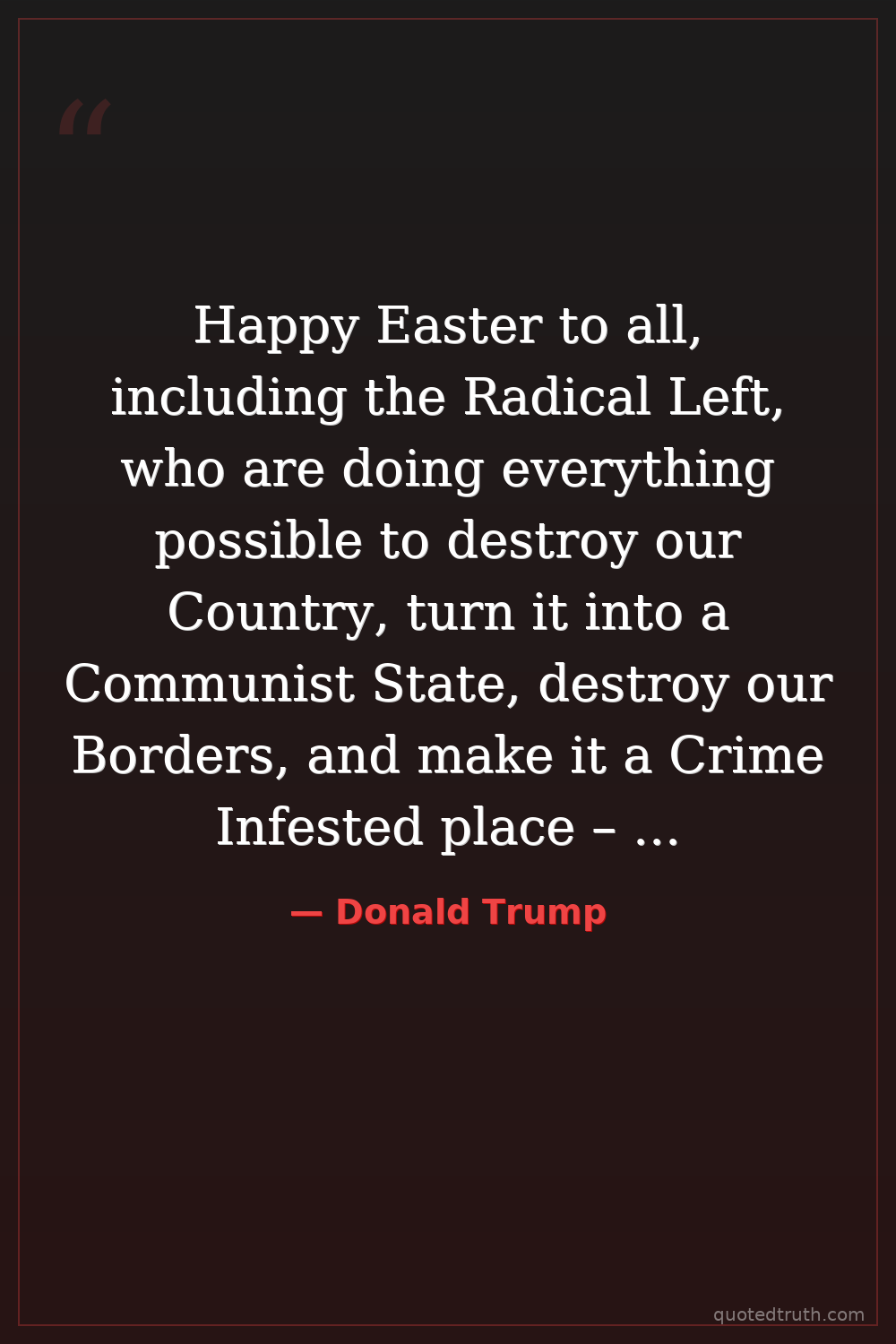 Happy Easter to all, including the Radical Left, who are doing everything possible to destroy our Country, turn it into a Communist State, destroy our Borders, and make it a Crime Infested place – but, as always, we will win!