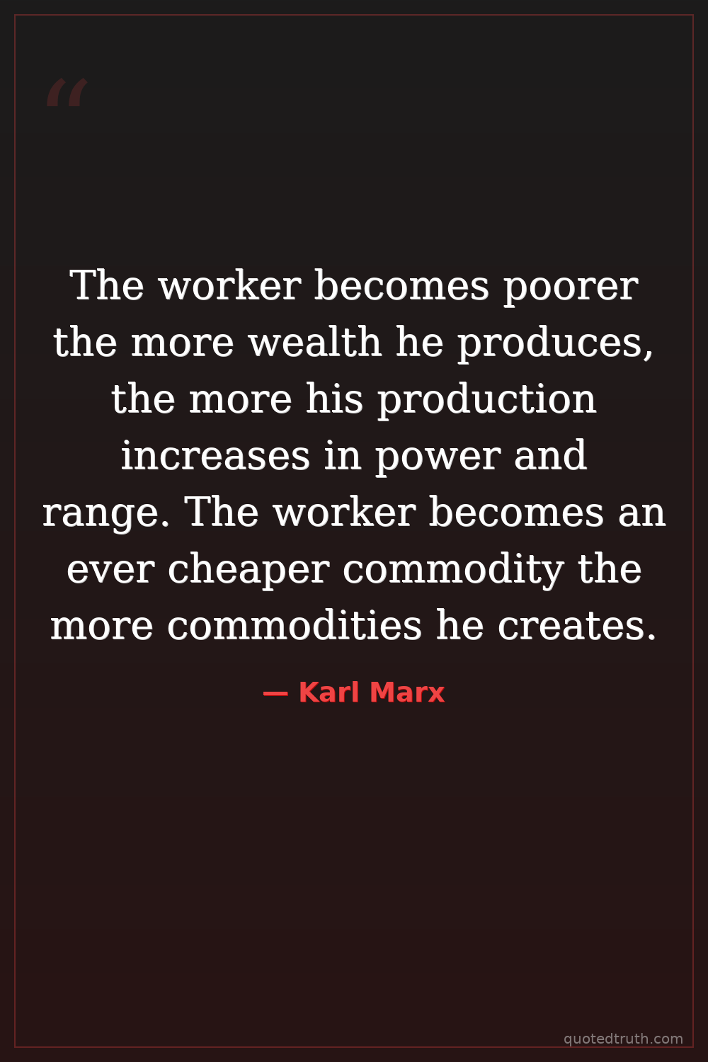 The worker becomes poorer the more wealth he produces, the more his production increases in power and range. The worker becomes an ever cheaper commodity the more commodities he creates.