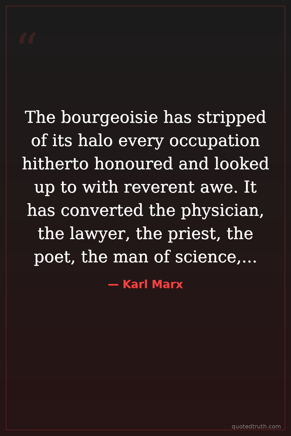 The bourgeoisie has stripped of its halo every occupation hitherto honoured and looked up to with reverent awe. It has converted the physician, the lawyer, the priest, the poet, the man of science, into its paid wage-labourers. — Karl Marx Modern Communist Manifesto, Das Kapital