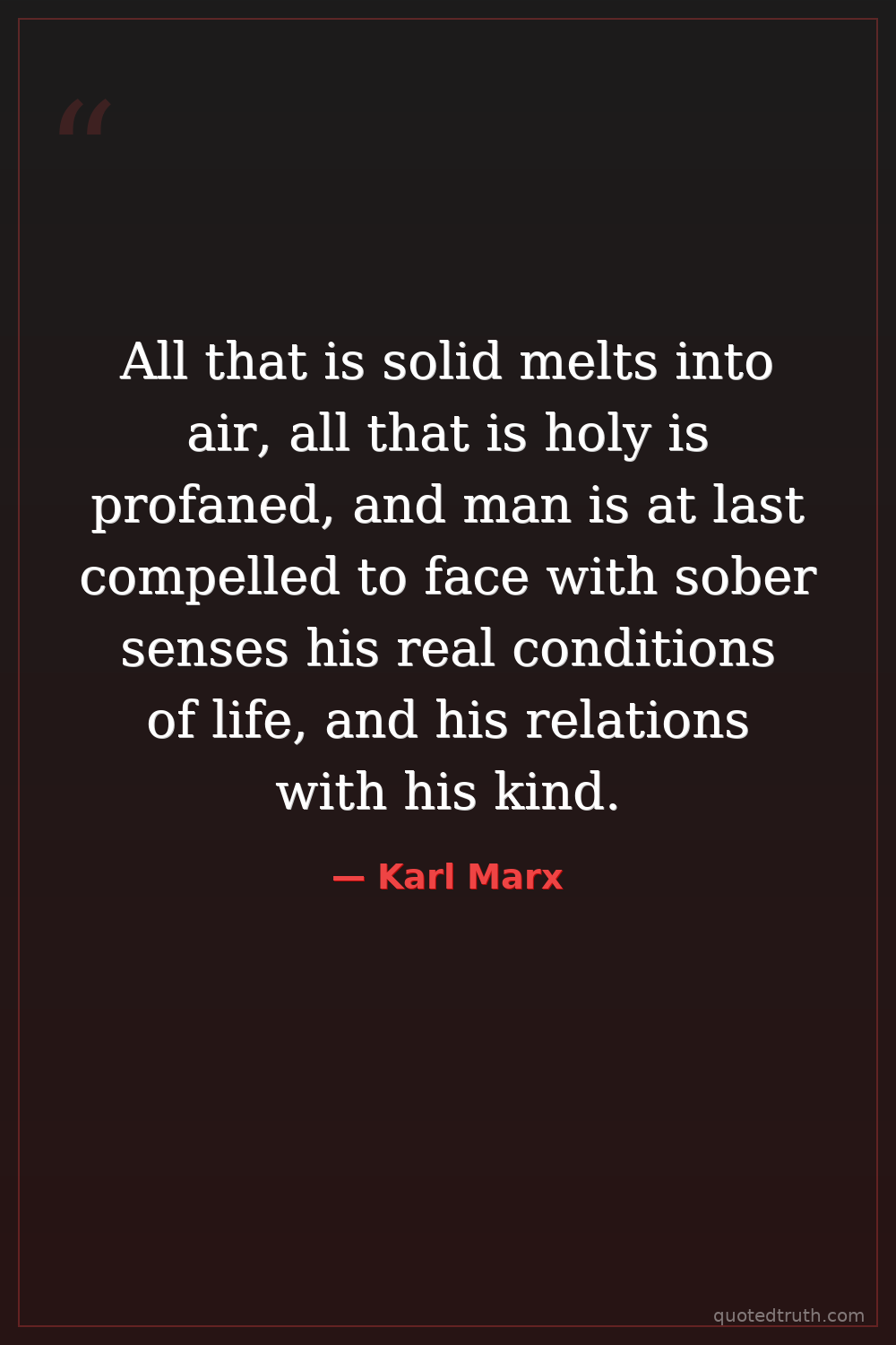 All that is solid melts into air, all that is holy is profaned, and man is at last compelled to face with sober senses his real conditions of life, and his relations with his kind.