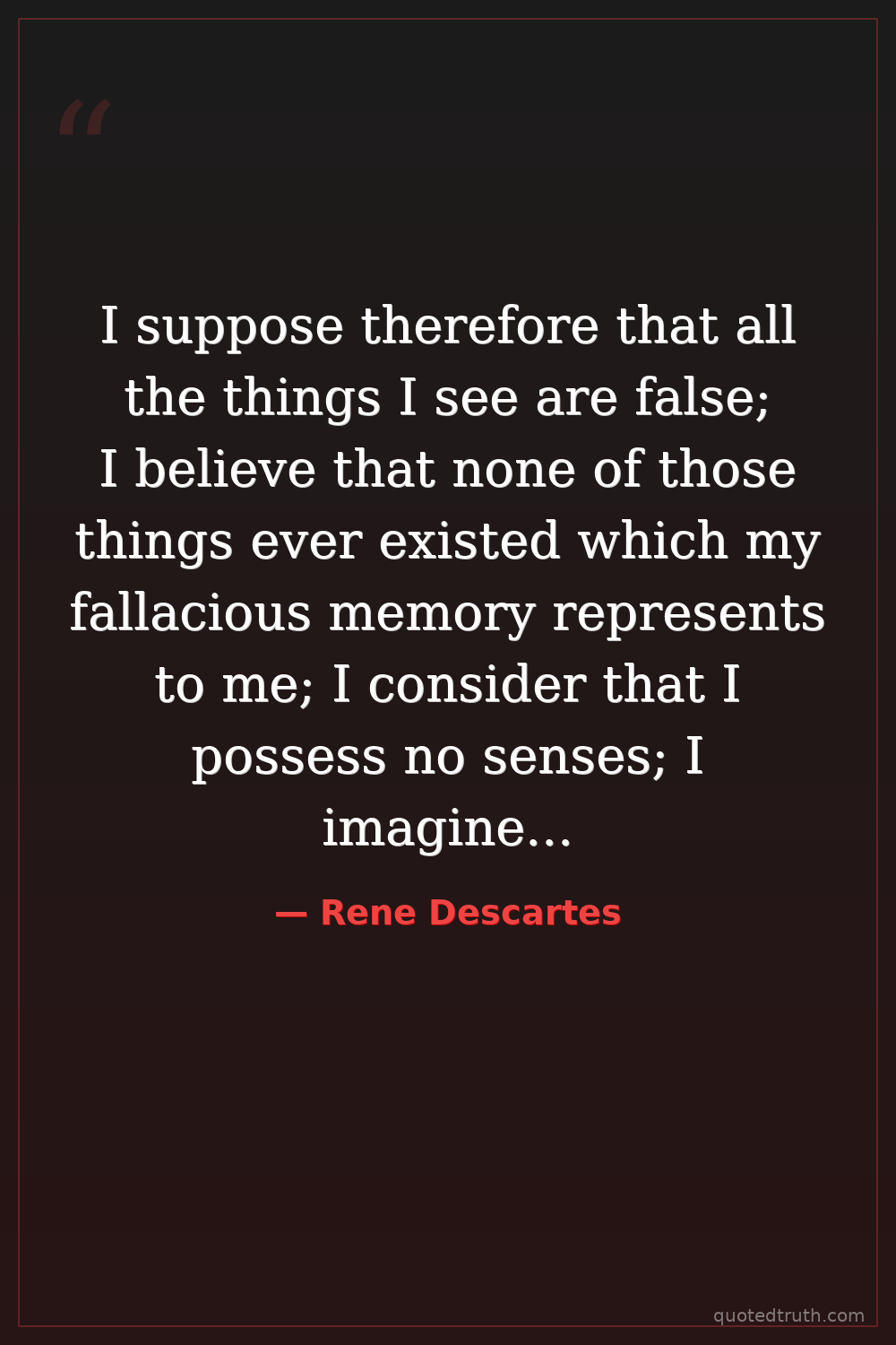 I suppose therefore that all the things I see are false; I believe that none of those things ever existed which my fallacious memory represents to me; I consider that I possess no senses; I imagine that body, figure, extension, motion and place are but fictions of my mind. What then, in short, can be esteemed as true? Perhaps nothing at all, unless that there is nothing certain.
