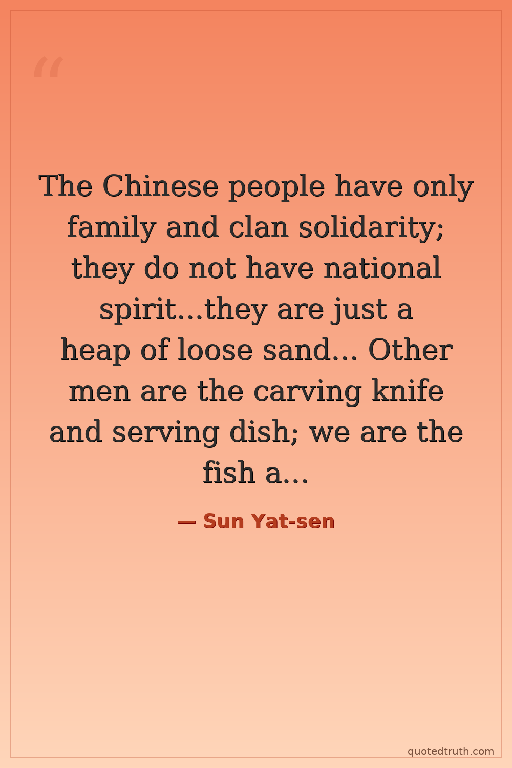 The Chinese people have only family and clan solidarity; they do not have national spirit...they are just a heap of loose sand... Other men are the carving knife and serving dish; we are the fish and the meat.