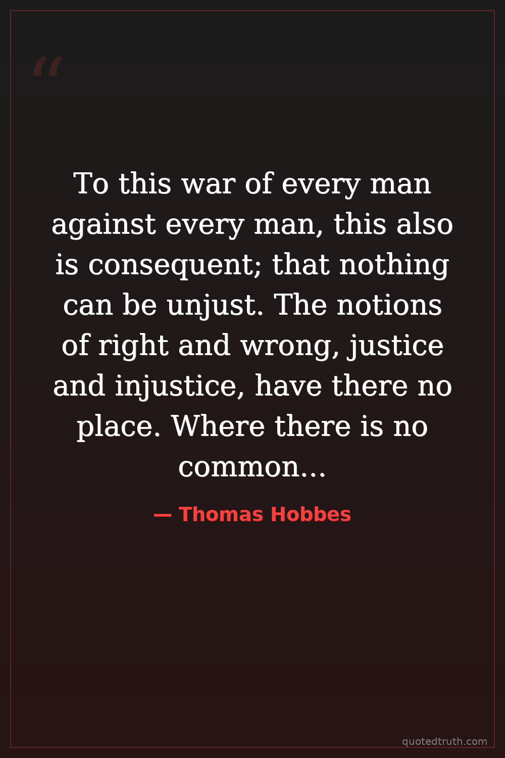 To this war of every man against every man, this also is consequent; that nothing can be unjust. The notions of right and wrong, justice and injustice, have there no place. Where there is no common power, there is no law: where no law, no injustice. Force, and fraud, are in war the two cardinal virtues.