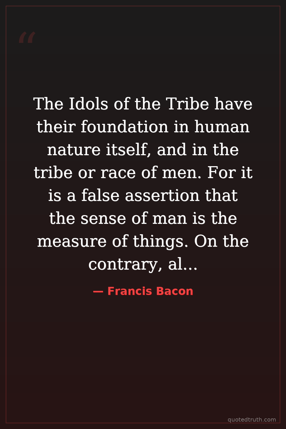 The Idols of the Tribe have their foundation in human nature itself, and in the tribe or race of men. For it is a false assertion that the sense of man is the measure of things. On the contrary, all perceptions as well of the sense as of the mind are according to the measure of the individual and not according to the measure of the universe. And the human understanding is like a false mirror, which, receiving rays irregularly, distorts and discolors the nature of things by mingling its own nature with it.