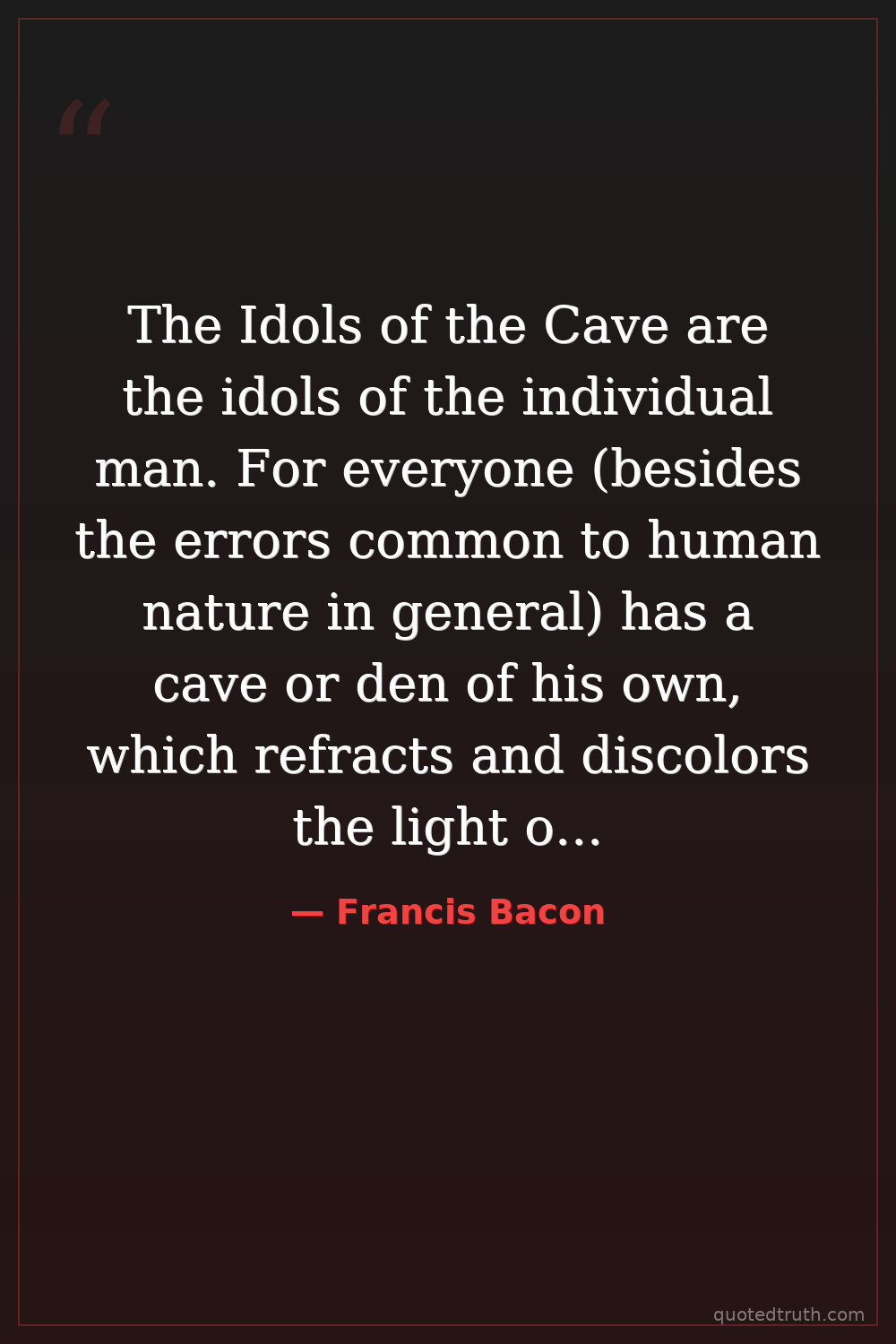 The Idols of the Cave are the idols of the individual man. For everyone (besides the errors common to human nature in general) has a cave or den of his own, which refracts and discolors the light of nature; owing either to his own proper and peculiar constitution, or to his education and conversation with others, or to the books he reads, and the authority of those whom he esteems and admires, or to the differences of impressions, accordingly as they happen to be received in a mind preoccupied and predisposed or in a mind indifferent and settled, or the like. So that the spirit of man (according as it is meted out to different individuals) is a thing variable and full of perturbation, and governed as it were by chance.