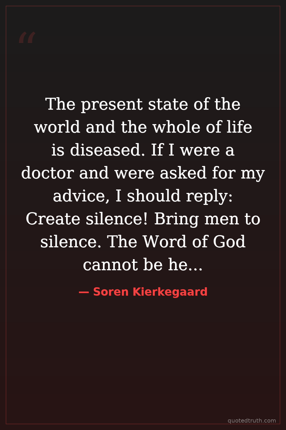 The present state of the world and the whole of life is diseased. If I were a doctor and were asked for my advice, I should reply: Create silence! Bring men to silence. The Word of God cannot be heard in the market-place of life. — Soren Kierkegaard Modern Father of existentialism