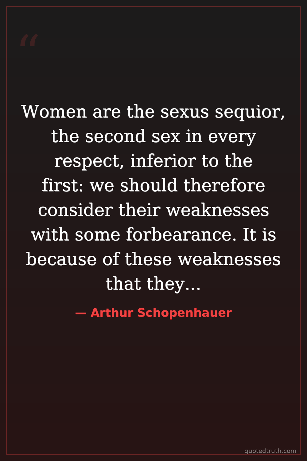 Women are the sexus sequior, the second sex in every respect, inferior to the first: we should therefore consider their weaknesses with some forbearance. It is because of these weaknesses that they are called the fair sex, for they are neither intellectual, nor moral, nor aesthetic, but only fair.